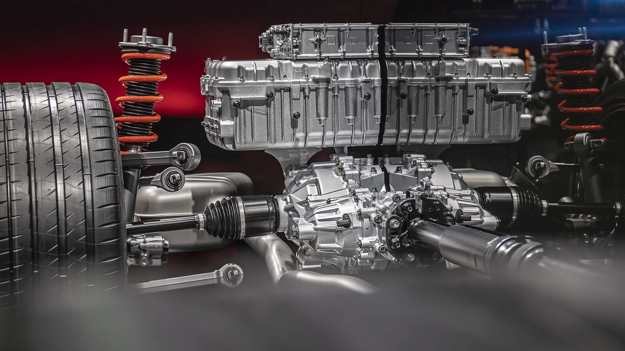 Este conceito não é inédito, uma vez que também o Porsche Taycan conta com uma transmissão de duas velocidades no eixo traseiro, adequando-se assim a diferentes utilizações – o arranque e aceleração até cerca dos 140 km/h faz-se com uma velocidade, cabendo a um atuador elétrico a tarefa de mudar para a segunda velocidade, correspondendo a uma rotação máxima do motor elétrico de 13.500 rpm.Bateria inspirada na Fórmula 1