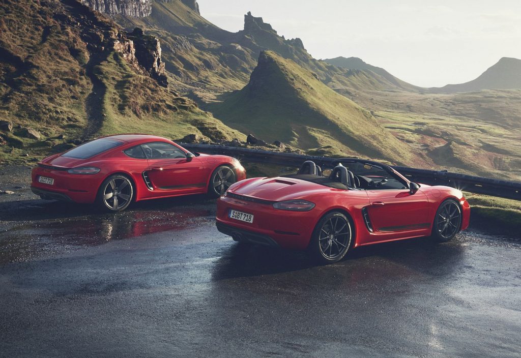 A nova versão dos modelos Boxster e Cayman combina o motor boxer turbo de quatro cilindros, capaz de debitar 300 CV às 7500 rpm, com a experiência de condução Porsche mais dinâmica, inspirando-se no conceito do 911 T de 1968. Para demarcar esta variante das demais, os modelos ‘T’ recebem um extenso pacote de equipamento, o qual inclui jantes de 20 polegadas, suspensão PASM desportiva com menos 20 milímetros de altura ao solo – oferecida, pela primeira vez, em combinação com o motor sobrealimentado de 2.0 litros de capacidade – alavanca da caixa de velocidades mais curta, na qual o diagrama surge em vermelho, e Pacote Sport Chrono.