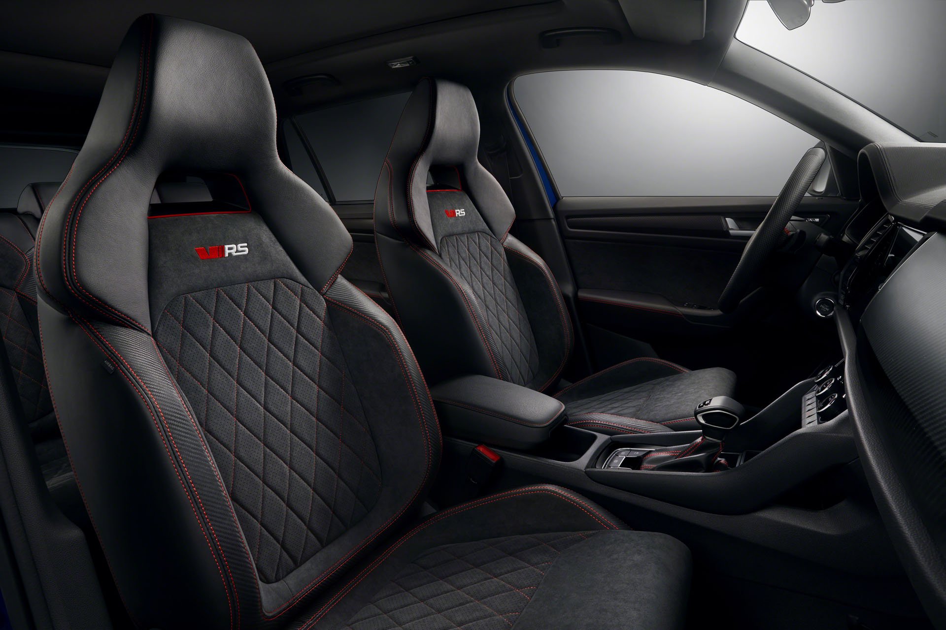 Outro exemplo disso mesmo são os bancos diferentes em estilo ‘bacquet’ com maior suporte do corpo, em Alcantara perfurada e ponteada a vermelho em padrão ‘diamante’. De resto, pedais em alumínio e outros elementos em carbono dão a tónica para este modelo desportivo que será o Diesel mais potente da história da Skoda.