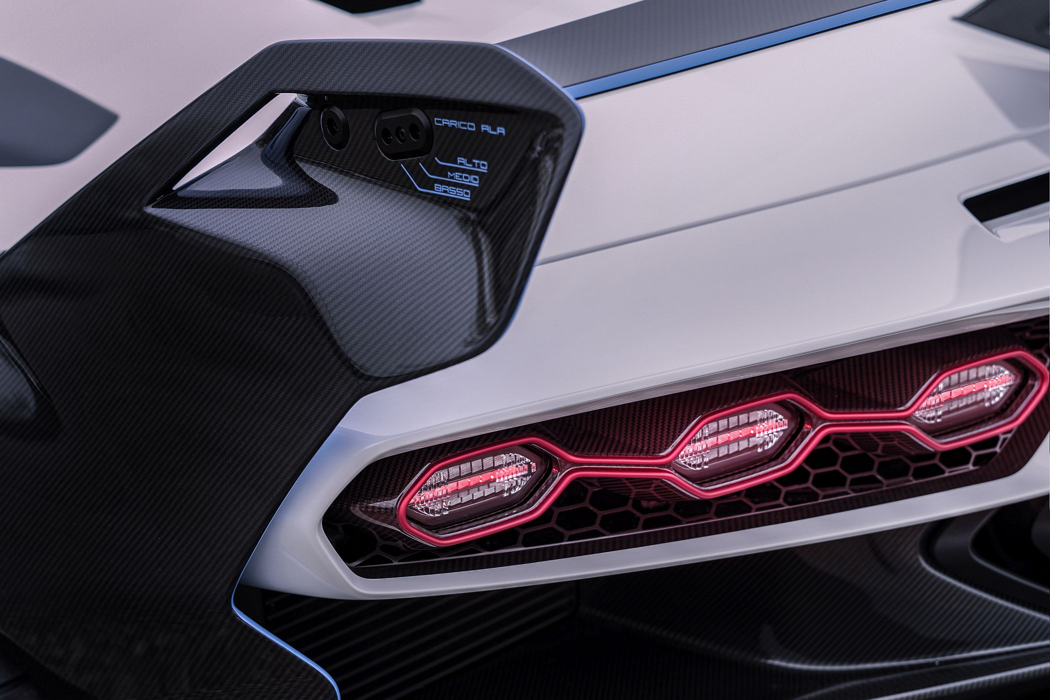 O splitter dianteiro está ladeado por duas barbatanas e as entradas de ar no capot dianteiro são inspiradas nas do Huracán GT3 EVO, enquanto as laterais esculpidas refletem as soluções adotadas no Essenza SCV12. A traseira musculada está encimada por uma grande asa em fibra de carbono que pode ser ajustada em três posições em termos de carga aerodinâmica: baixa, média e alta.