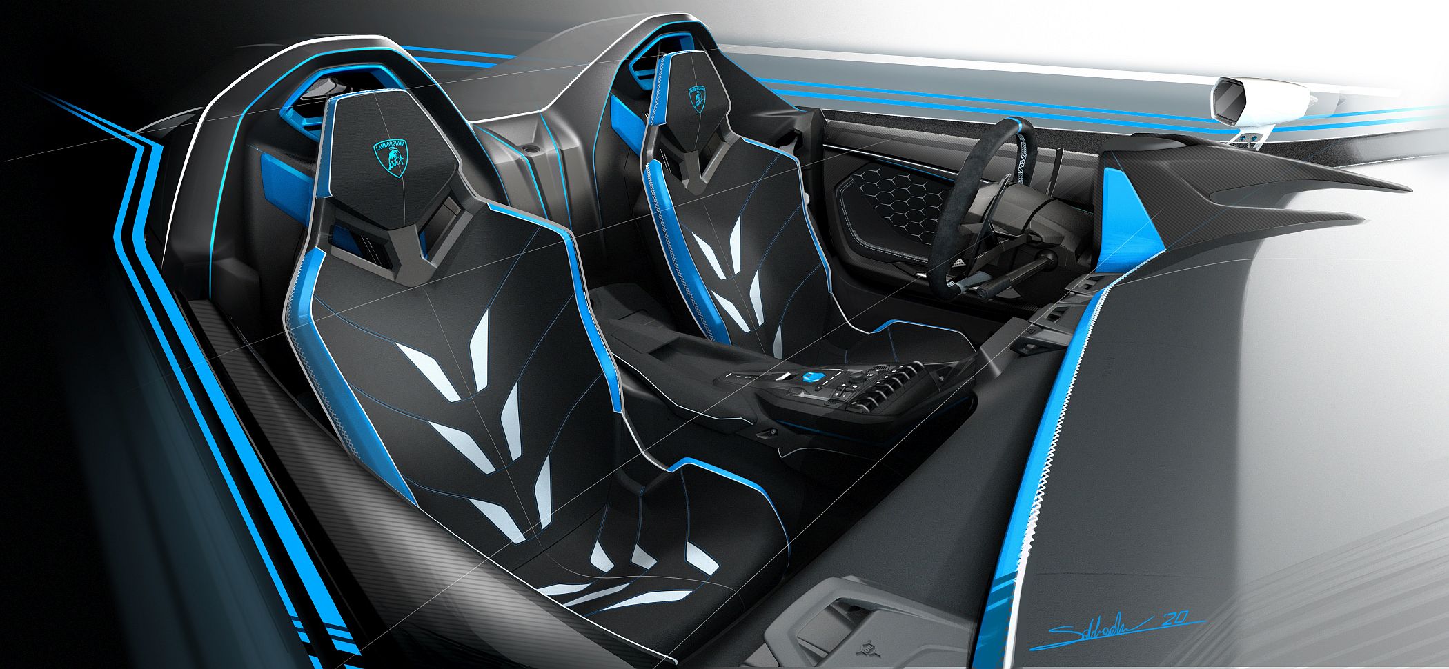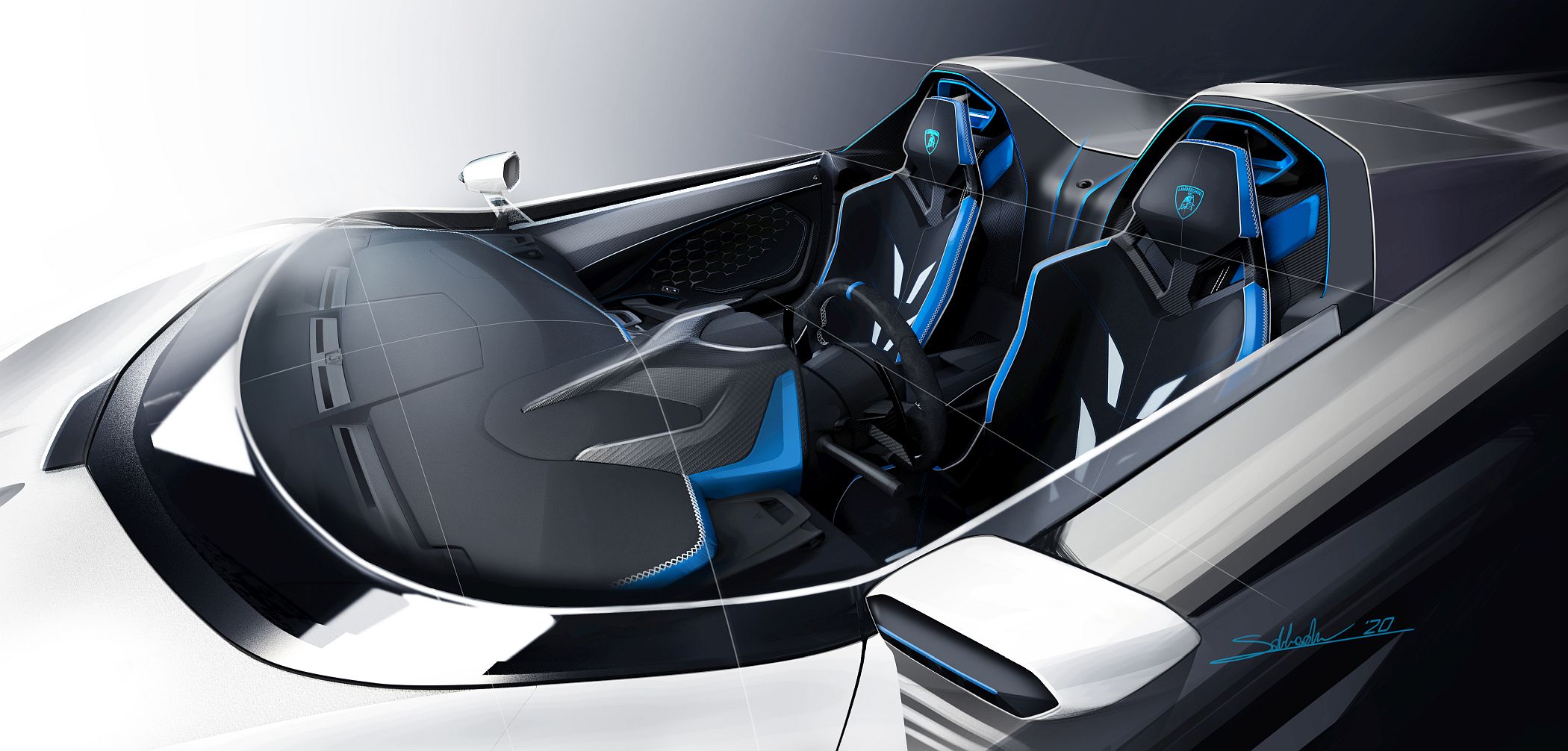 “Dois anos após o SC18 Alston, o SC20 foi um desafio novo e intrigante. As principais fontes de inspiração foram o Diablo VT Roadster, o Aventador J, o Veneno Roadster e o Concept S e o resultado é uma combinação dramática de criatividade e atitude de competição”, explica Mitja Borkert, diretor de Design do Lamborghini Centro Stile.