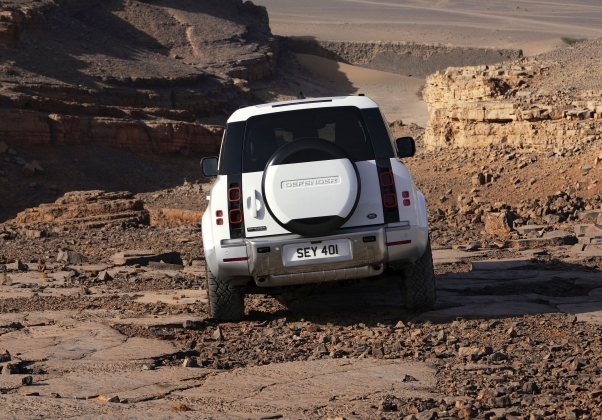 Para garantir as suas capacidades fora de estrada, os engenheiros da Land Rover incluíram uma elevação subtil na traseira com estilo de barco, para um ângulo de saída de 28,5 graus. O contorno dos farolins traseiros em LED foi redesenhado para manter as três linhas exclusivas que definem o perfil lateral do Defender e se elevam subtilmente na secção traseira.