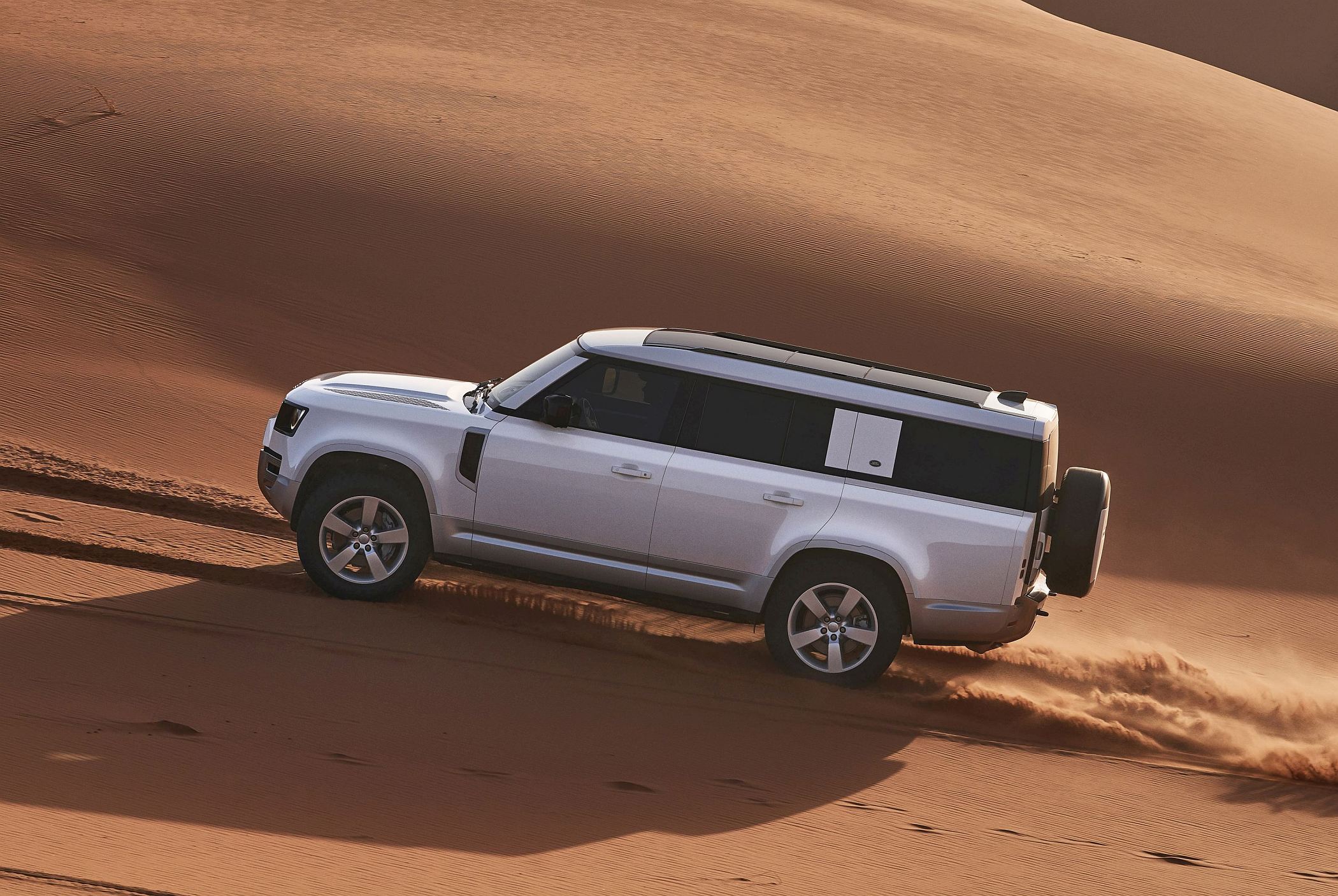 No exterior, o Defender 130 oferece um visual de explorador sofisticado, com nova cor ‘Sedona Red’, podendo ainda contar com um pacote de personalização ‘Extended Bright Pack’, a qual proporciona uma pose mais exclusiva e um acabamento ‘Ceres Silver Satin’ na secção inferior da carroçaria em todo o veículo.