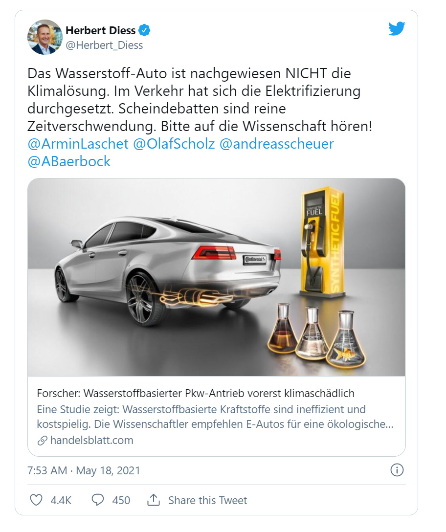 O tweet de Diess também visou Andreas Scheuer, ministro alemão dos transportes e das infraestruturas digitais, e incluiu um link para um artigo no jornal de negócios alemão Handelsblatt relatando um estudo apoiando as afirmações de Diess.