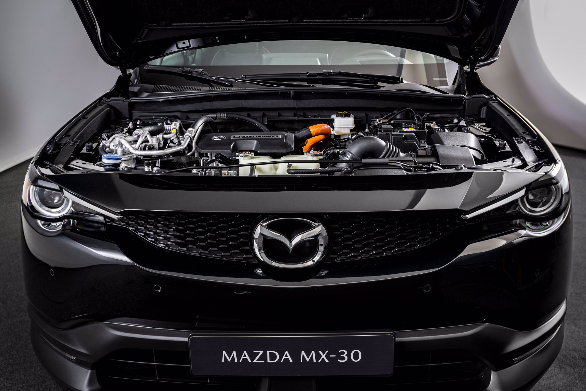 A Mazda optou por um motor rotativo para alimentar este gerador, tirando partido da capacidade única dos motores rotativos na produção da potência a partir de um pequeno bloco. Este motor ‘rotativo’ 8C de nova conceção está alojado no compartimento mecânico, juntamente com o gerador e uma máquina elétrica de elevada potência. Este MX-30 dispõe de uma bateria de iões de lítio de 17.8 kWh e a um depósito de gasolina de 50 litros de capacidade, resultando num sistema plug-in híbrido único. O motor elétrico de 125 kW proporciona prestações ligeiramente melhores do que as do MX-30 EV.
