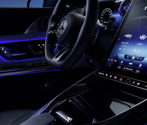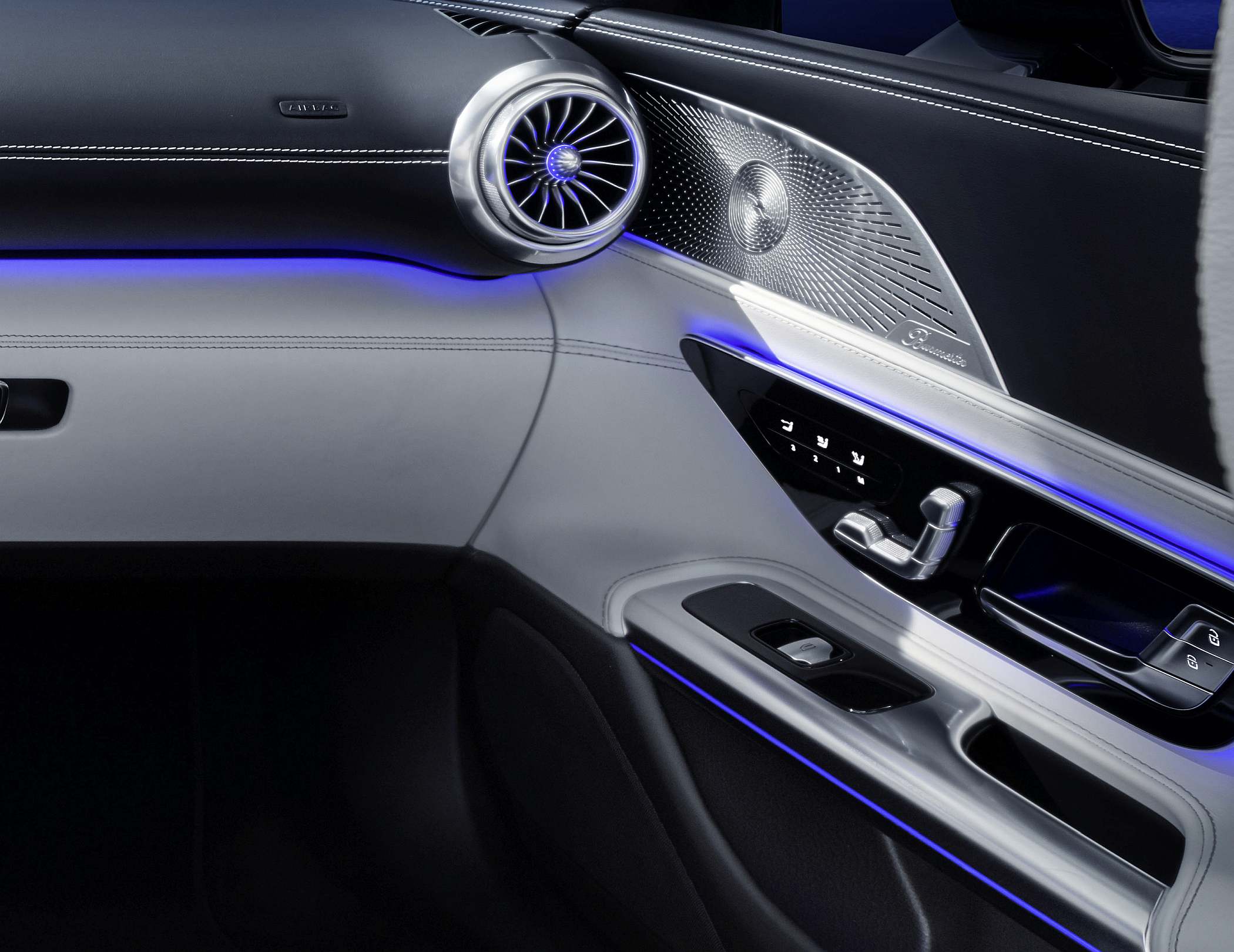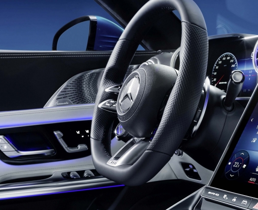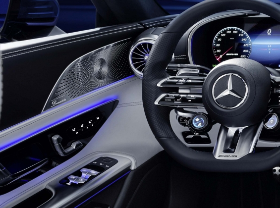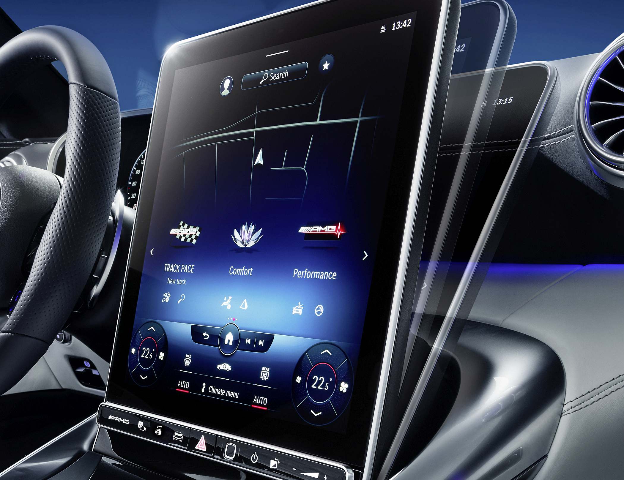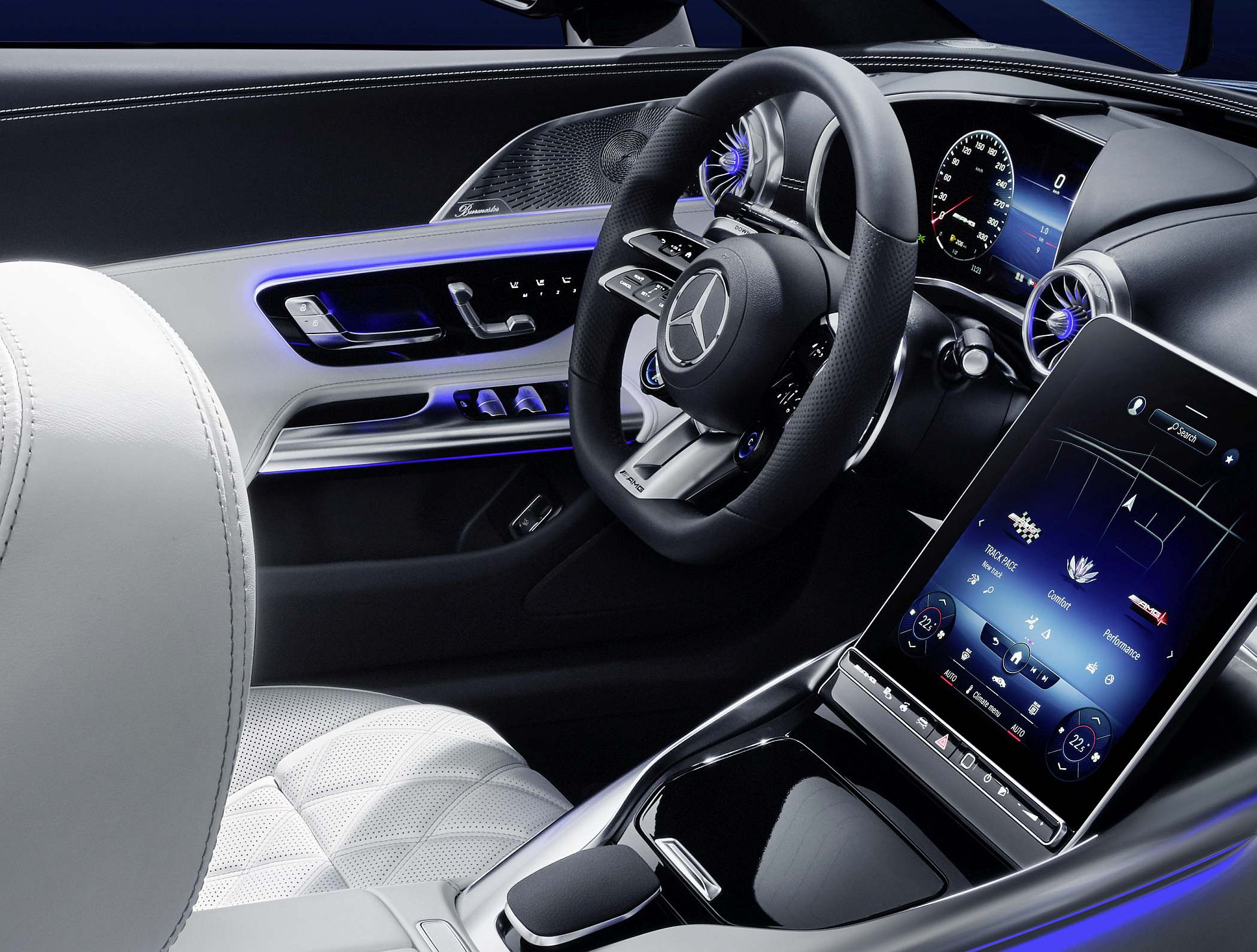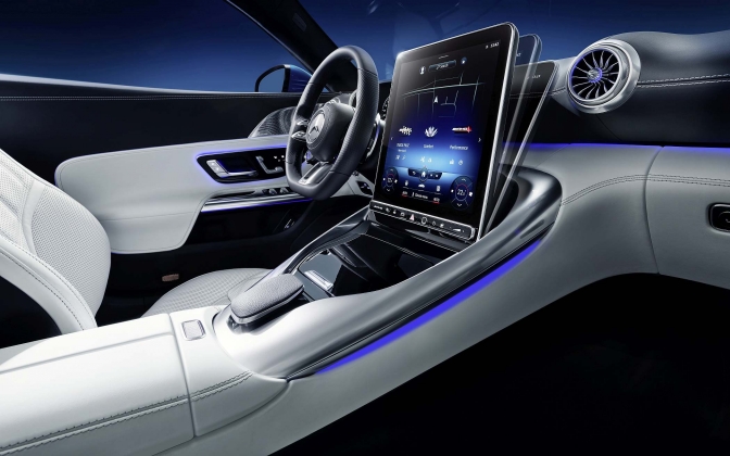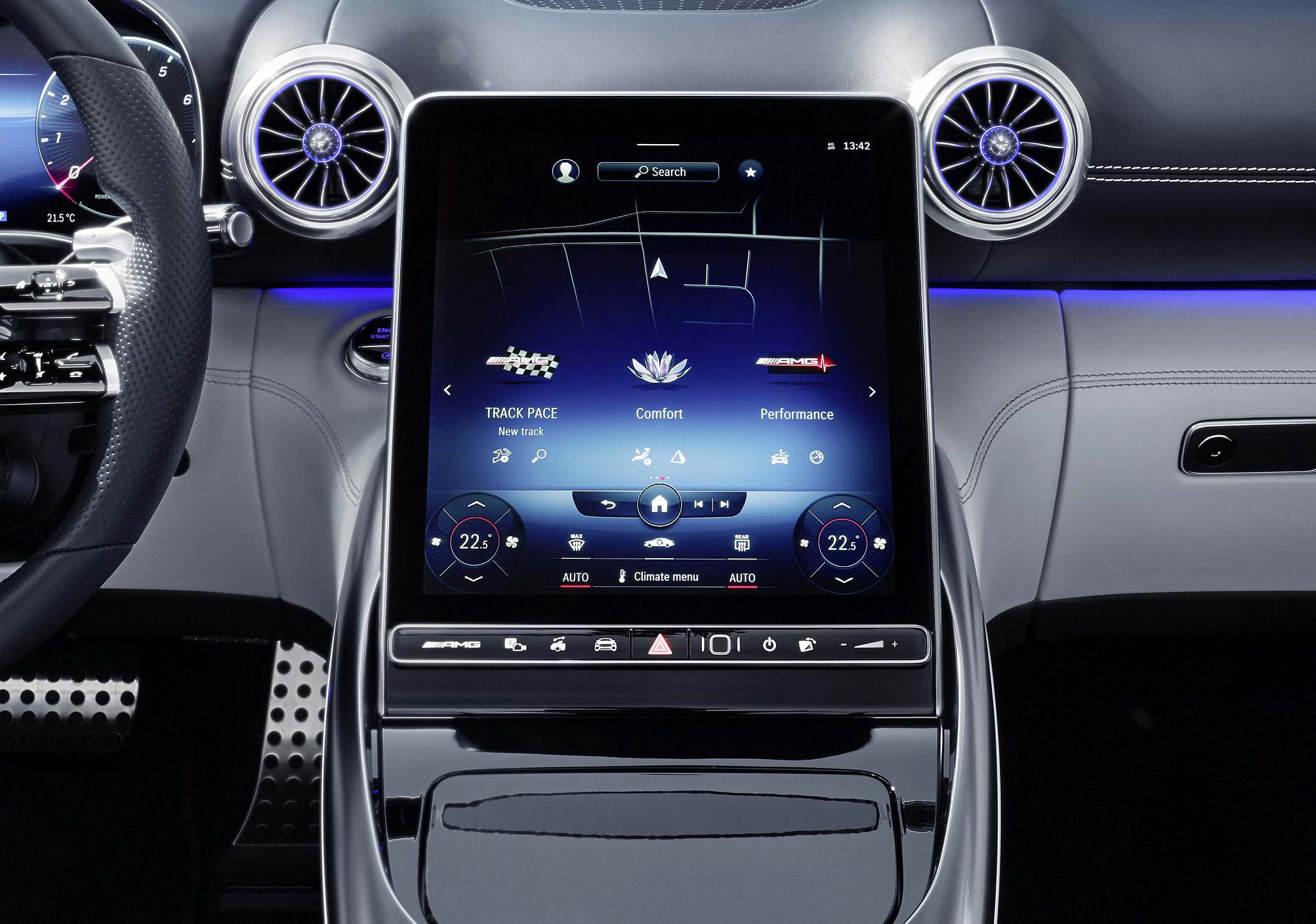 A marca alemã garante que foi buscar inspiração ao AMG GT e GT Coupé, mas aqui há novidades como o ecrã tátil de 11,9″ que pode ser reclinado e orientado para qualquer um dos lados.