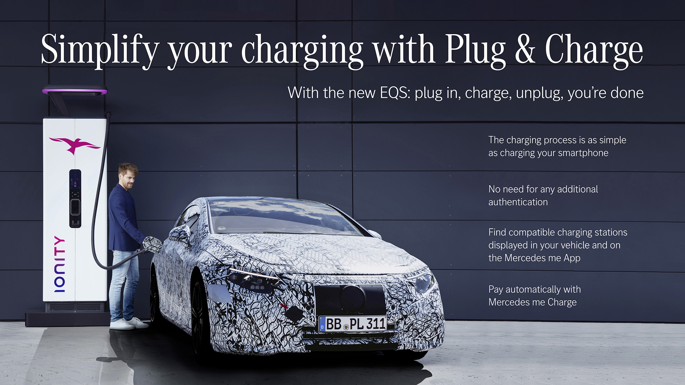 O veículo e a estação de carregamento comunicam diretamente através do cabo de carregamento. Tal como anteriormente, os clientes do Mercedes me Charge continuam a beneficiar da função de pagamento integrada com pagamento automático. O cliente escolhe o método de pagamento preferido apenas uma vez.