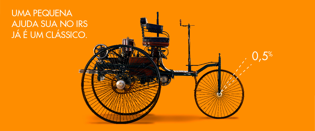 A campanha tem como título “Uma pequena ajuda sua no IRS já é um clássico” e como mote “Ajude-nos a manter o nosso património histórico sobre rodas”, alusivos aos automóveis do Museu do Caramulo e tem por base o Benz Dreirad de 1886, um dos vários modelos centenários da colecção.