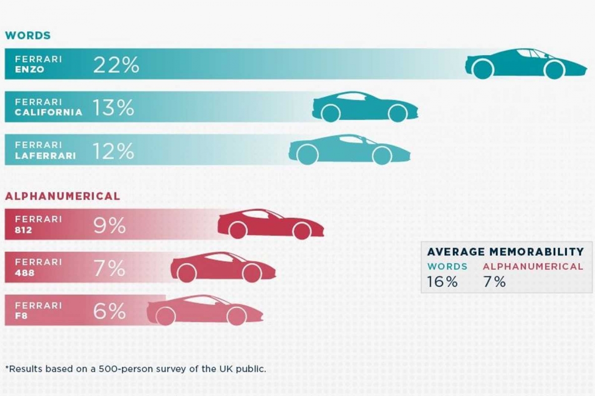 O estudo contou com a participação de 500 britânicos, inquiridos sobre 253 modelos de 45 marcas diferentes, para aferir que tipo de designação tem mais eficácia perante o consumidor e perdura mais facilmente na memória coletiva. Designações alfanuméricas parecem ser as menos aconselháveis, como prova o catálogo da Ferrari.
