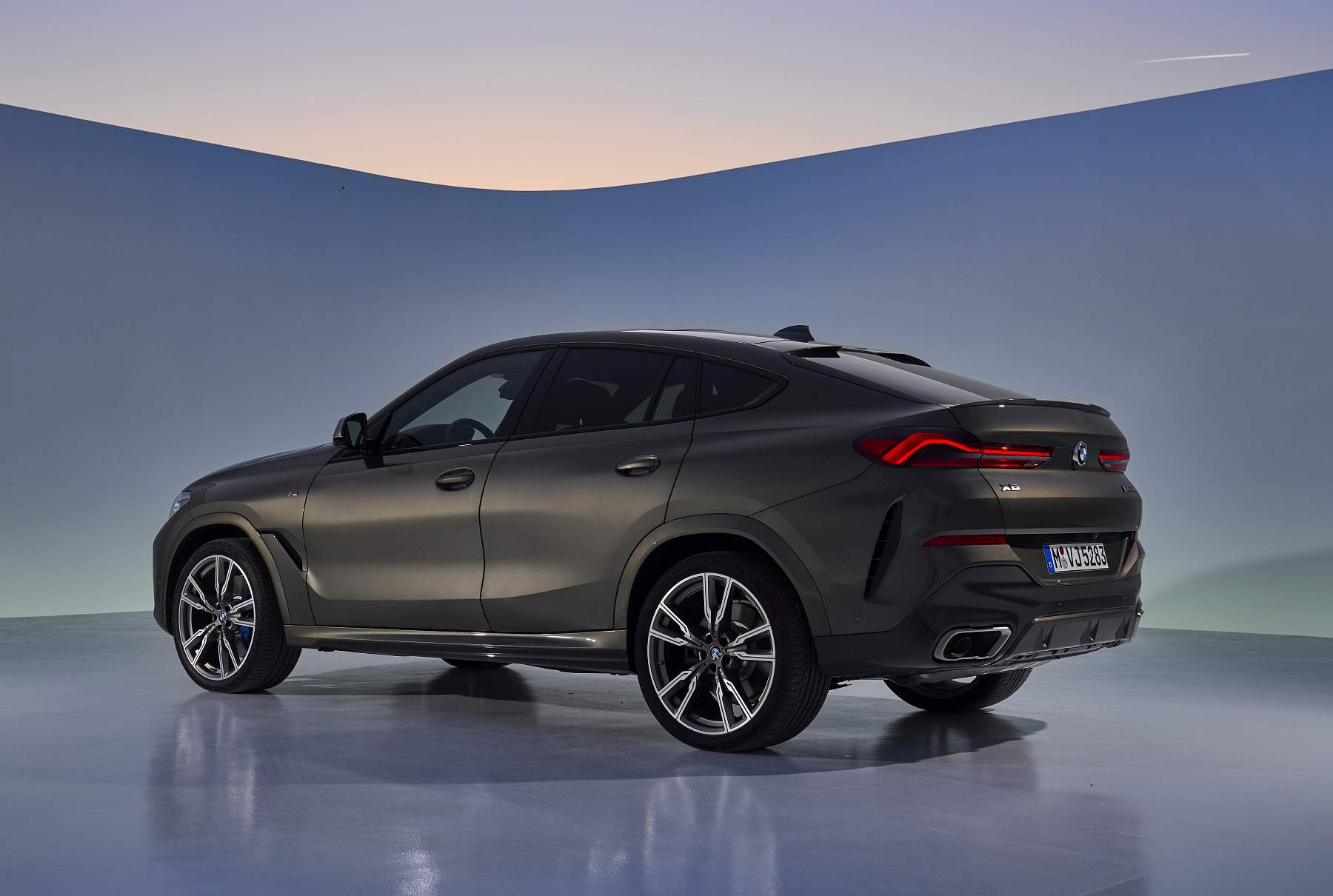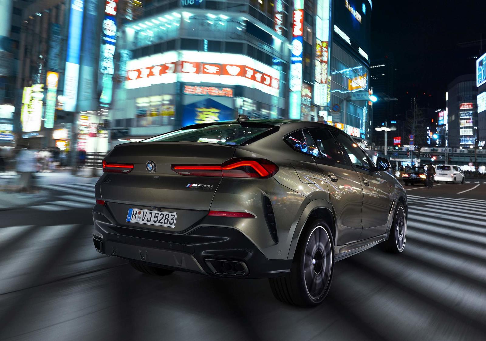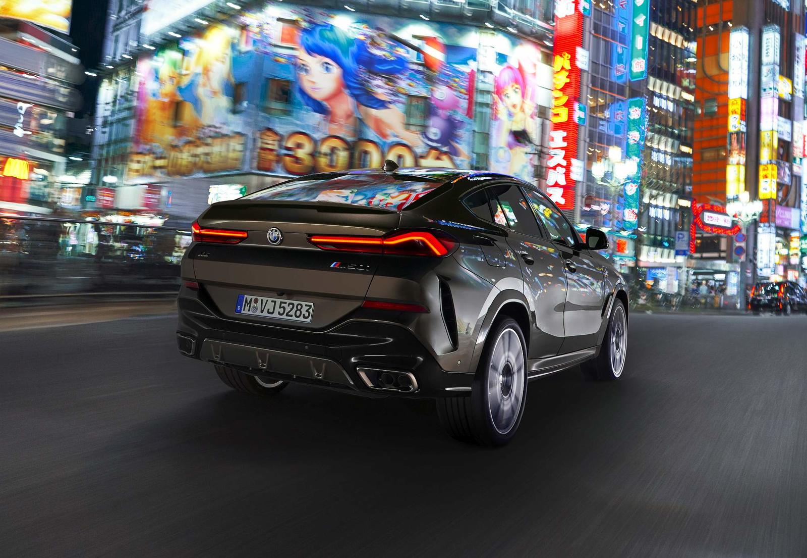 Do pilar B para trás há uma linha claramente descendente do tejadilho rumo à traseira, com spoiler duplo entrecortado a meio no tejadilho. Os farolins LED de grandes dimensões configuram um visual mais largo e nota ainda para as duas áreas de ventilação nas áreas externas do para-choques. A linha dinâmica do tejadilho é reforçada pela gama de jantes com dimensões que começam nas 19 polegadas de série e que culminam em opções de 22 polegadas. No caso dos X6 M50i e BMW X6 M50d as jantes de série são de 21 polegadas.