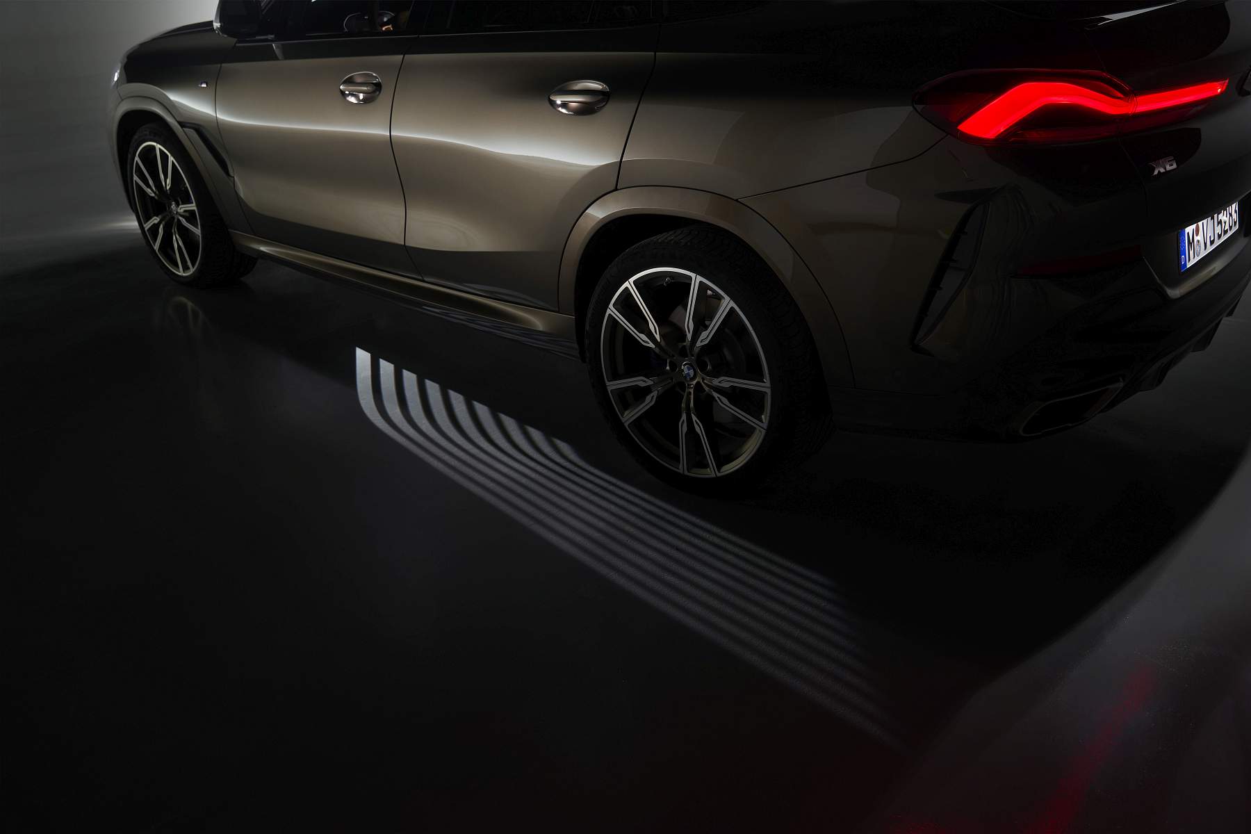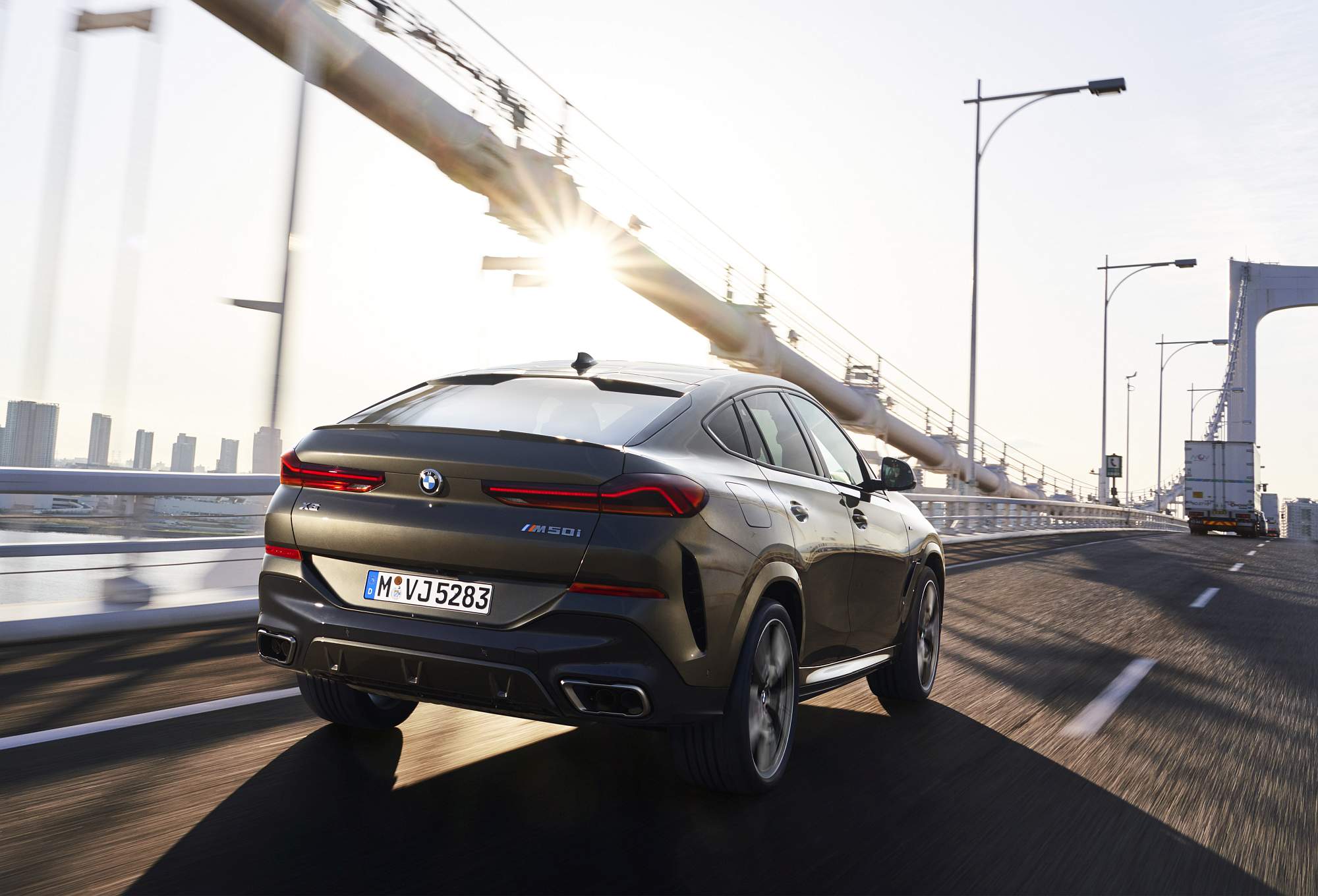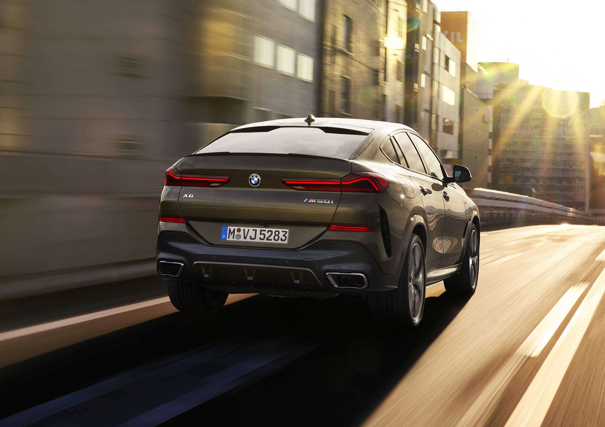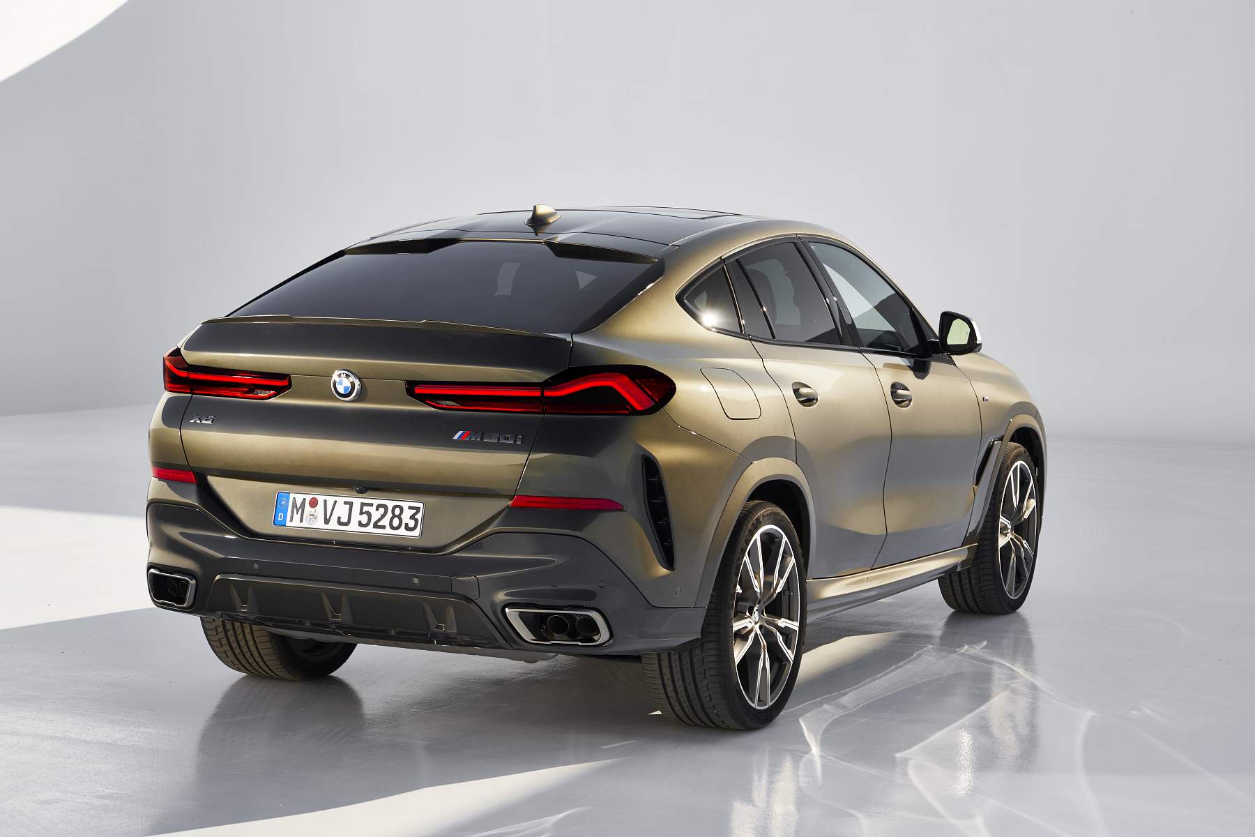 Do pilar B para trás há uma linha claramente descendente do tejadilho rumo à traseira, com spoiler duplo entrecortado a meio no tejadilho. Os farolins LED de grandes dimensões configuram um visual mais largo e nota ainda para as duas áreas de ventilação nas áreas externas do para-choques. A linha dinâmica do tejadilho é reforçada pela gama de jantes com dimensões que começam nas 19 polegadas de série e que culminam em opções de 22 polegadas. No caso dos X6 M50i e BMW X6 M50d as jantes de série são de 21 polegadas.