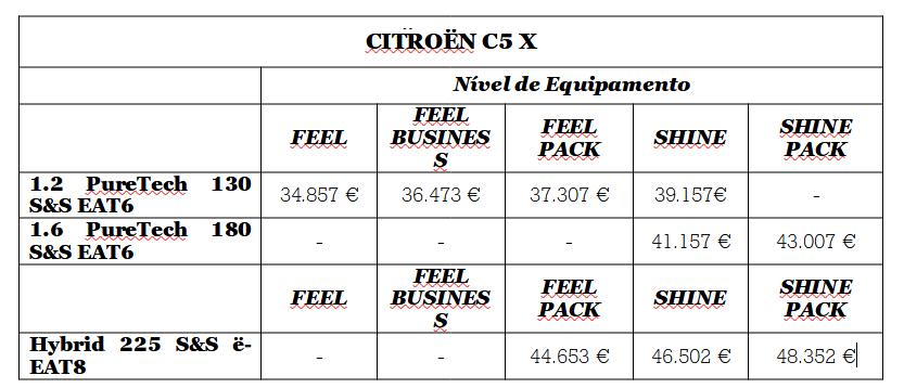 O novo Citroën C5 X chegará aos concessionários da marca no mês de junho, com cinco níveis de equipamento (um é, na verdade, uma declinação para se adequar aos clientes empresariais): Feel, Feel Business S, Feel Pack, Shine e Shine Pack. Os preços arrancam nos 34.857 € no caso da versão 1.2 PureTech 130 S&S Feel. Já a versão híbrida tem um preço a arrancar nos 44.653 € no nível Feel Pack.