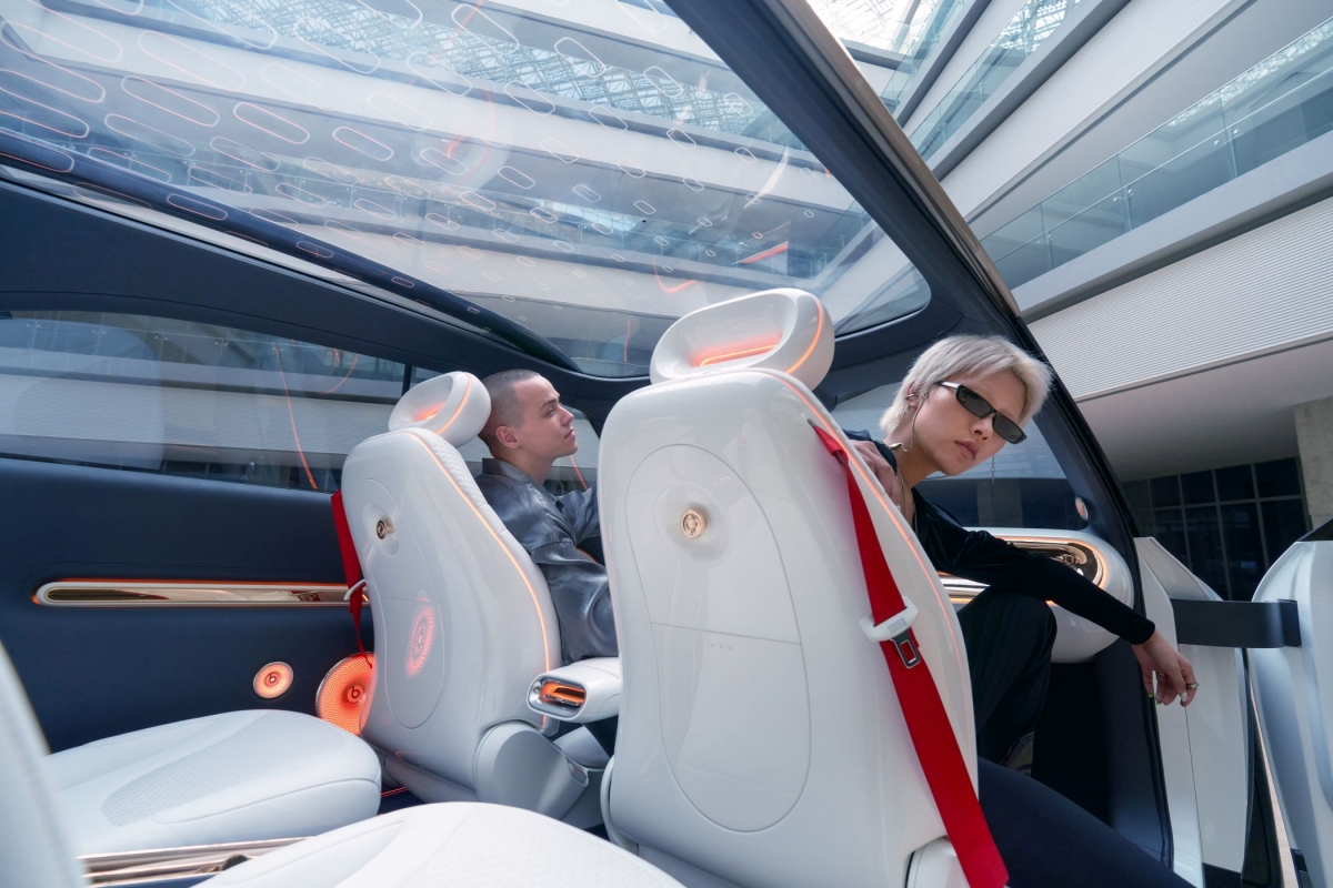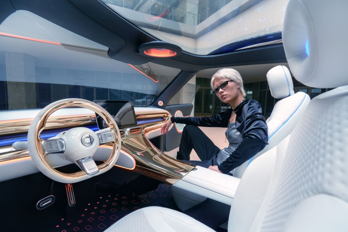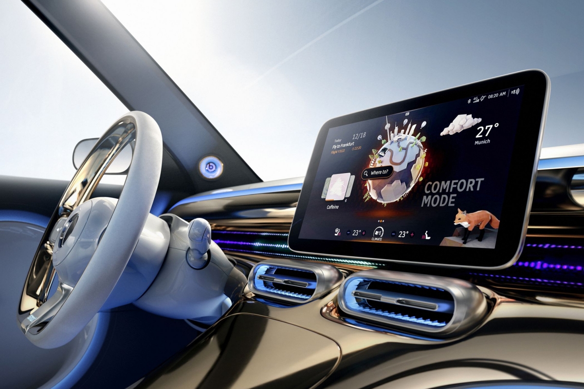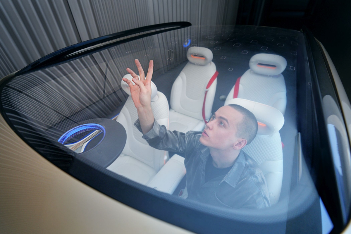 Um dos detalhes fundamentais do interior é o seu ecrã tátil 3D de 12.8 polegadas. Um globo tridimensional serve de centro de comando para esse ecrã, com um avatar de inteligência artificial a ajudar o utilizar a navegar através dos menus e funções do sistema. Graças à IA, esse assistente virtual poderá aprender constantemente a partir do comportamento do condutor, ajustando-se cada vez mais às suas preferências individuais. A consola central aparente flutuar entre os bancos dianteiros.