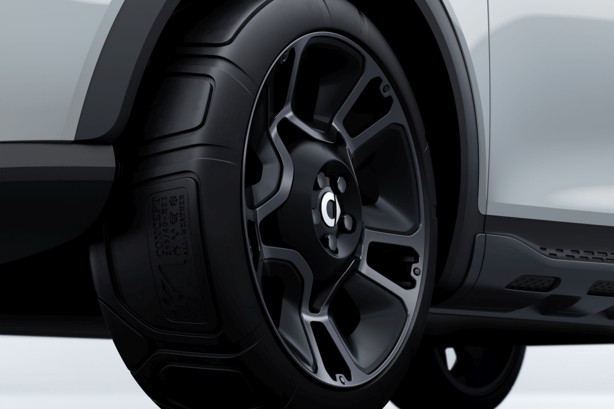 A transição quase contínua do tejadilho para o para-brisas e as janelas das portas sem molduras são outros elementos característicos do Concept #1, concedendo uma sensação de tejadilho flutuante. Os componentes da carroçaria em antracite e preto na parte inferior contribuem para a impressão de robustez geral, acentuada pelas jantes de 21 polegadas com design único.