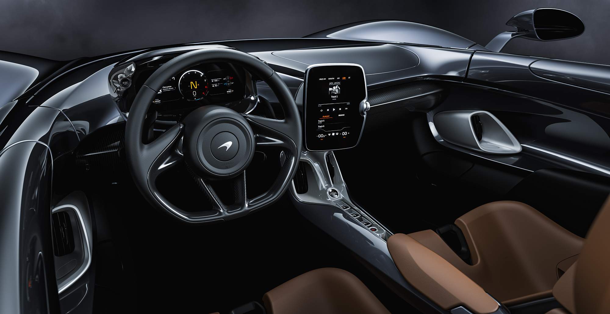 A aerodinâmica ativa permite, por exemplo, variar o nível de ar que chega ao motor consoante as necessidades de refrigeração do momento. Numa estreia para a Mclaren, os controlos para as funções Active Dynamics estão integrados no painel de instrumentos, de cada lado dos oráculos para o condutor. As funcionalidades adicionais podem ser acedidas por um ecrã central tátil de 8.0 polegadas, que foi desenvolvido para oferecer ao condutor acertar diferentes parâmetros ao mesmo tempo. O sistema mostra diversas aplicações no ecrã, como a navegação, telemetria de pista, câmara traseira e climatização. O ecrã está montado num braço em fibra de carbono de baixo peso, ligeiramente orientado para o condutor.