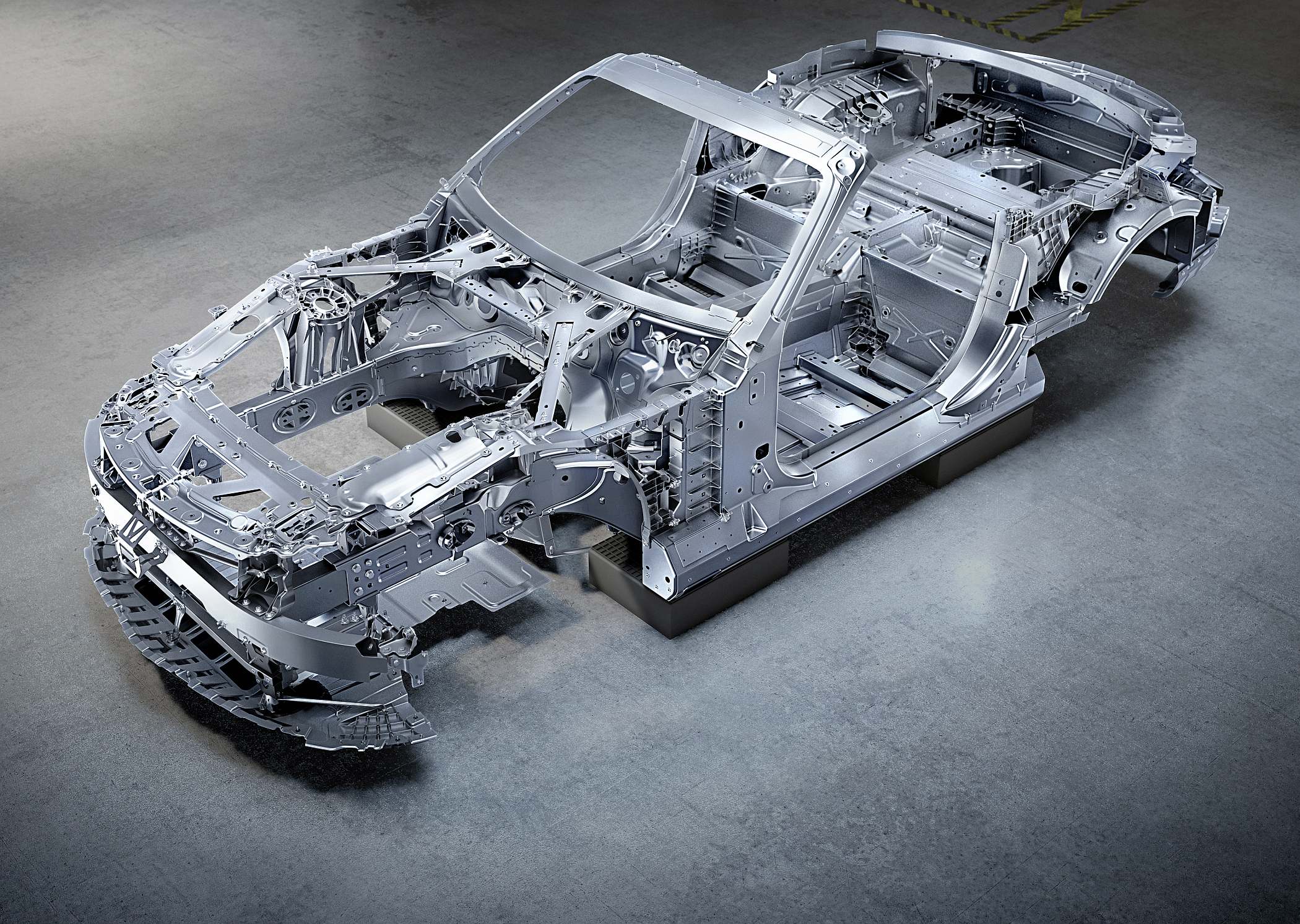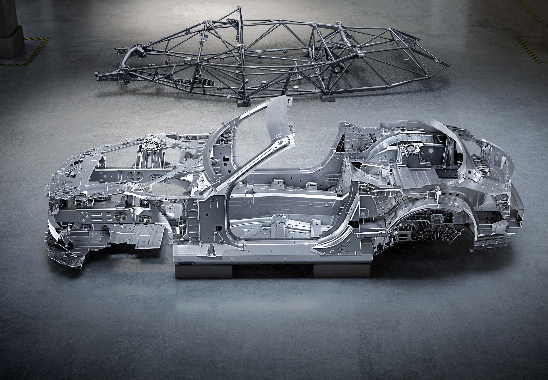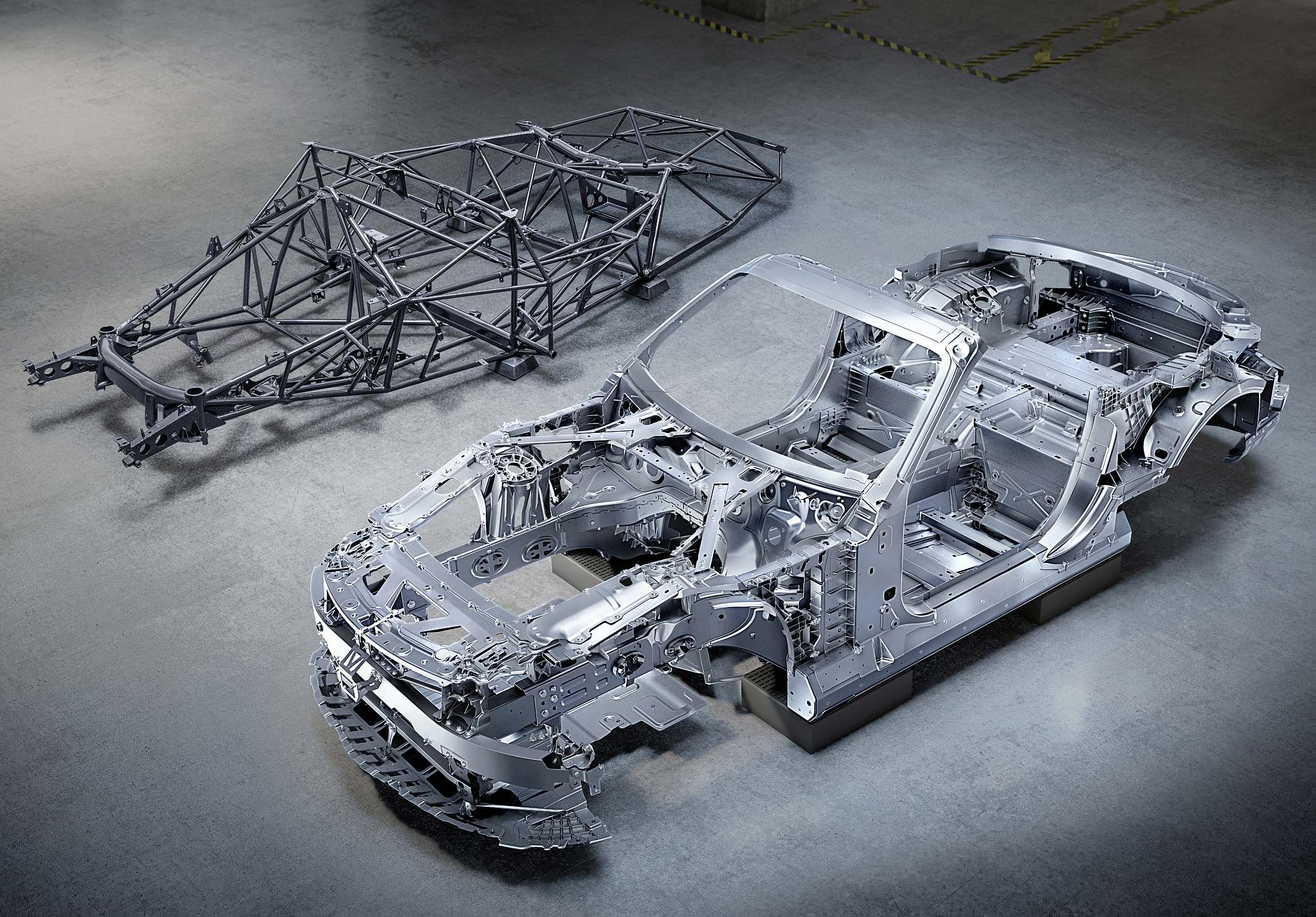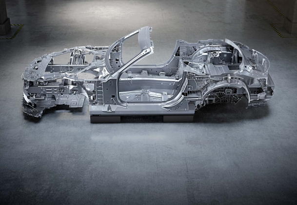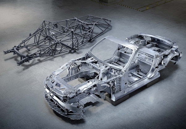 Exemplos do cuidado na procura de ligeireza e rigidez pode ser visto no suporte em magnésio para o painel de instrumentos, bem como o módulo dianteiro em ‘ponte’ feito em material misto de fibras de vidro e de carbono. Já a moldura do para-brisas, por outro lado, recorre a aço tubular de ultra-elevada resistência, atuando também com uma finalidade de segurança em conjugação com o sistema atrás dos bancos traseiros que se estende numa fração de segundo para ajudar os ocupantes no caso de capotamento.