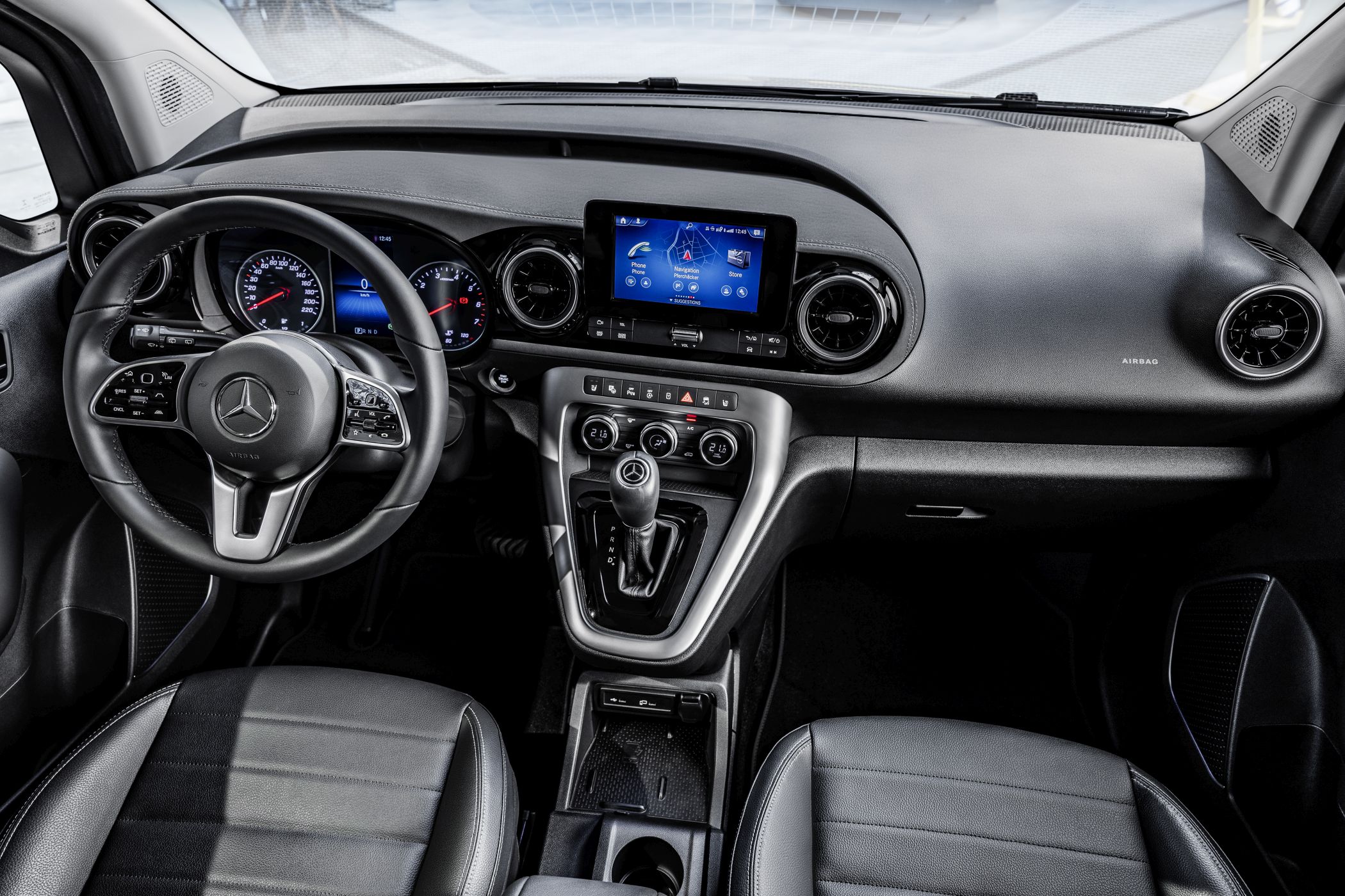O interior foi concebido para oferecer mais requinte e ambiente mais ‘atrevido’, com recurso a materiais de maior qualidade, como o revestimento em ‘Artica/Microcut’ ou o sistema MBUX com ecrã tátil de 7.0″ (dimensão máxima prevista), integração dos smartphones e navegação opcional. A tecnologia de conectividade inteligente com controlos por voz da Mercedes-Benz é outro dos elementos constantes da Classe T, bem como o sistema de carregamento por indução dos smartphones. O painel de instrumentos adota um visual mais clássico, mas conta com um ecrã central de 5.5 polegadas.Na secção traseira, existem 520 litros abaixo da chapeleira, mas no total, aproveitando todo o espaço disponível atrás dos dois bancos da frente, a Classe T poderá albergar até 2127 litros (2390 litros no máximo).