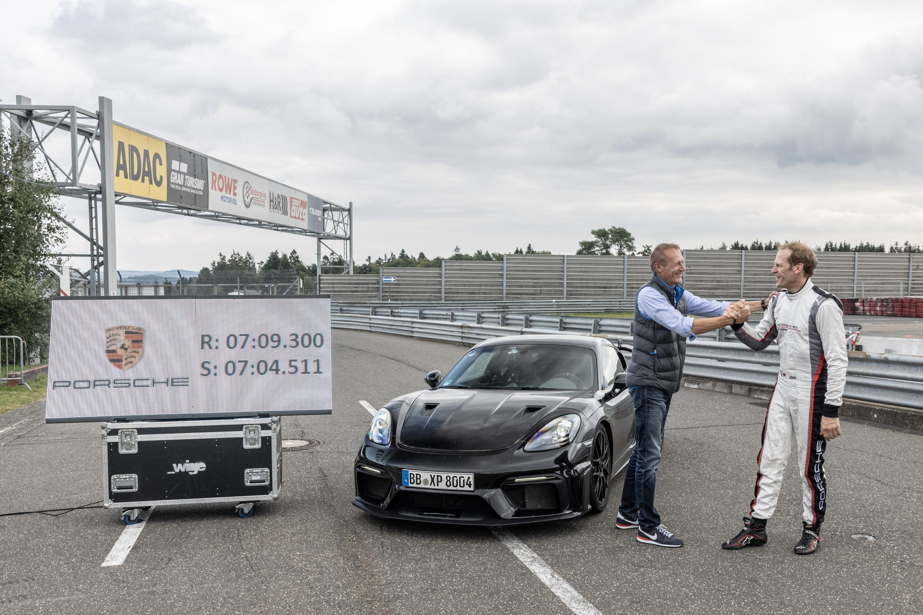 O piloto de desenvolvimento e embaixador da marca, Jörg Bergmeister, realizou uma volta de 20.832 quilómetros ao circuito alemão de Nürburgring Nordschleife em 7m09,300s num automóvel ligeiramente camuflado, enquanto a volta ligeiramente mais curta de 20,6 km, que servia anteriormente como referência, foi cumprida em 7m04,511s, sendo 23,6 segundos mais rápido que o seu irmão mais pequeno, o 718 Cayman GT4.