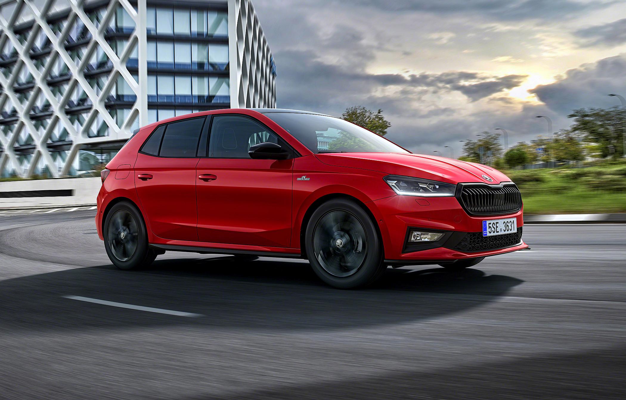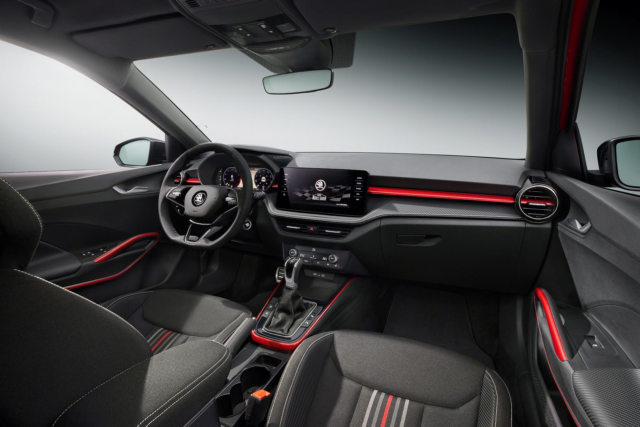 A bordo, há ainda elementos de série como os bancos desportivos, instrumentação digital Virtual Cockpit de 10.12 polegadas (personalizável) com fundo mais dinâmico, volante desportivo multifunções, num ambiente que é predominantemente preto, mas com as já referidas partes em vermelho e embelezamentos em carbono. Os pedais também têm uma aparência em alumínio, ao passo que as soleiras das portas apresentam o logótipo ‘Fabia’. A iluminação ambiente em LED fornece uma maior personalidade ao habitáculo.