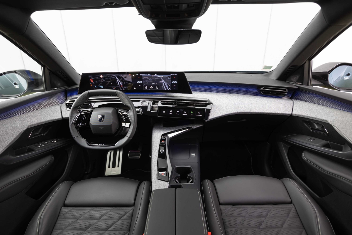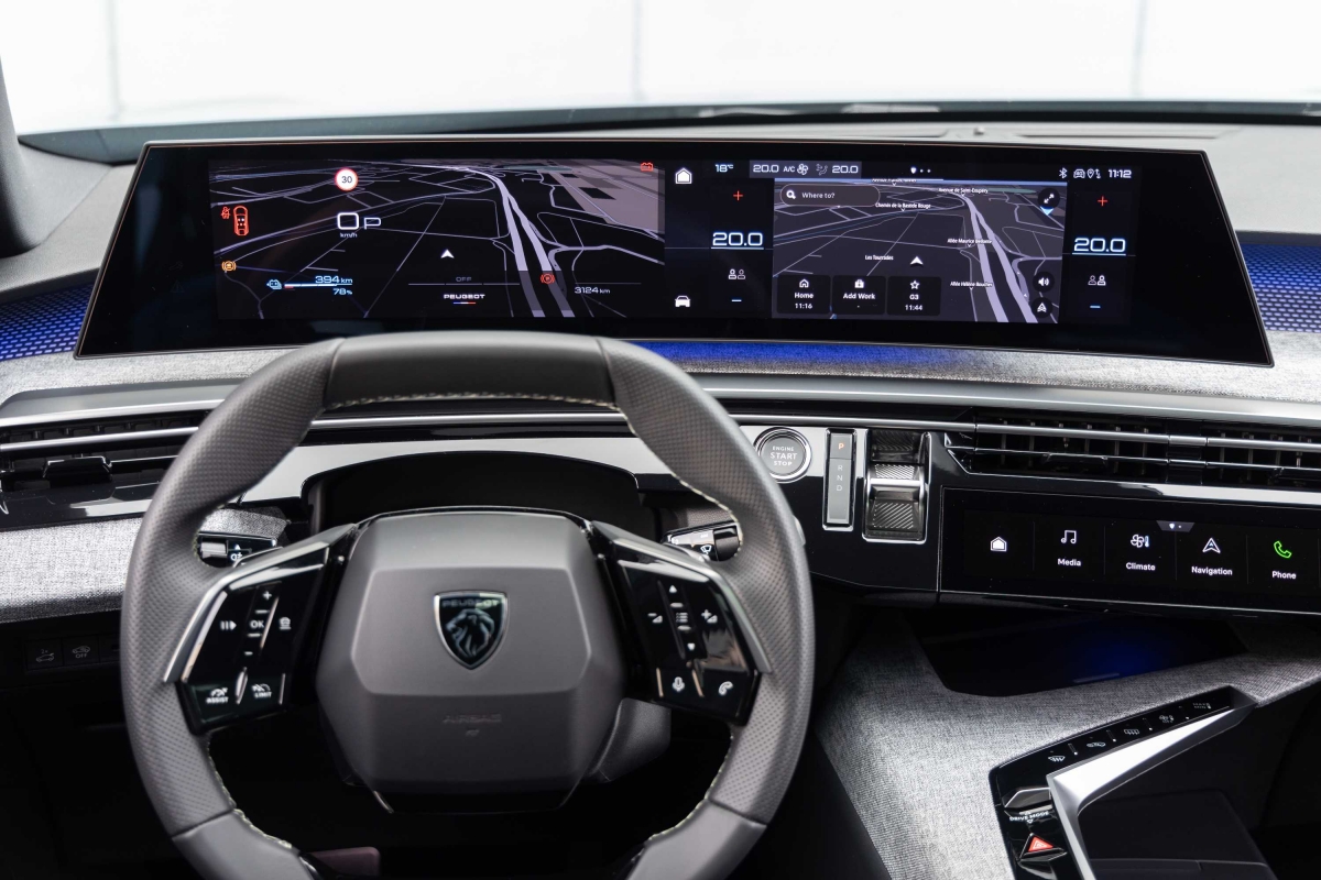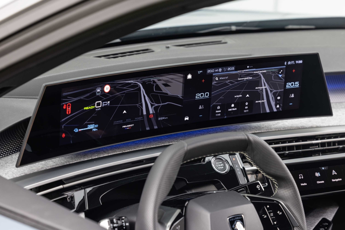 A expetativas criadas pelo design exterior são mantidas quando entramos no habitáculo do E-3008. O painel de instrumentos e o sistema multimédia (que inclui todos os elementos de controlo do veículo, navegação, climatização, etc.) foram fundidos num ecrã único de 21’’ que se estende de forma ligeiramente curva, dando ao condutor uma sensação de controlo e de que se encontra num cockpit – sensação essa reforçada pela consola central, igualmente assimétrica e curvada em direção ao banco do lado esquerdo.