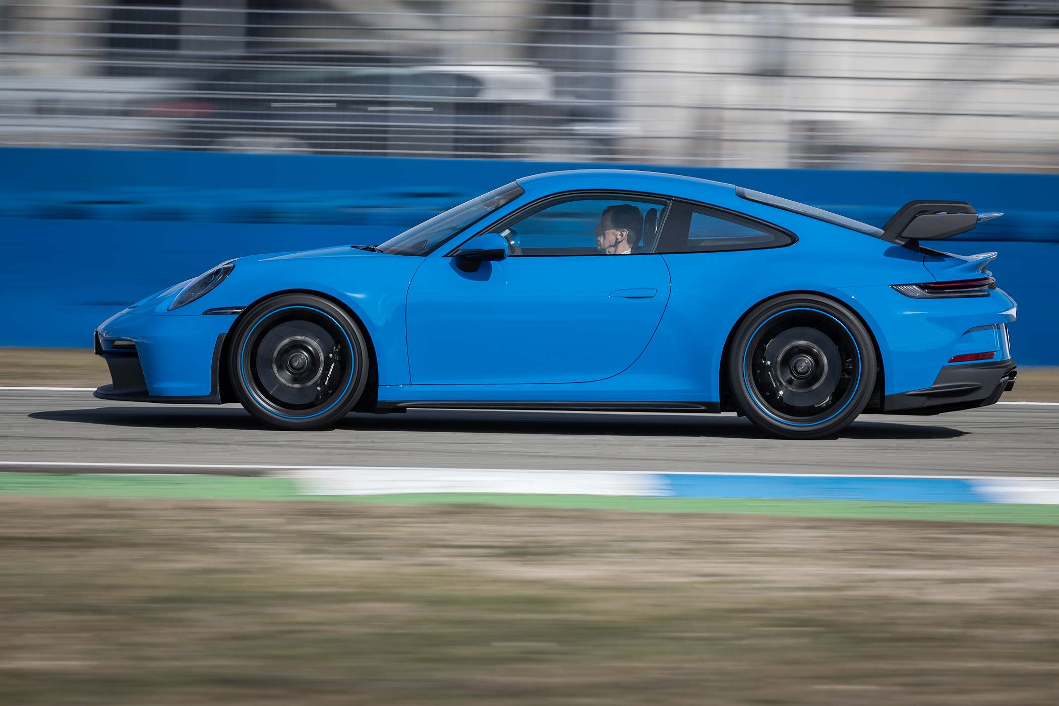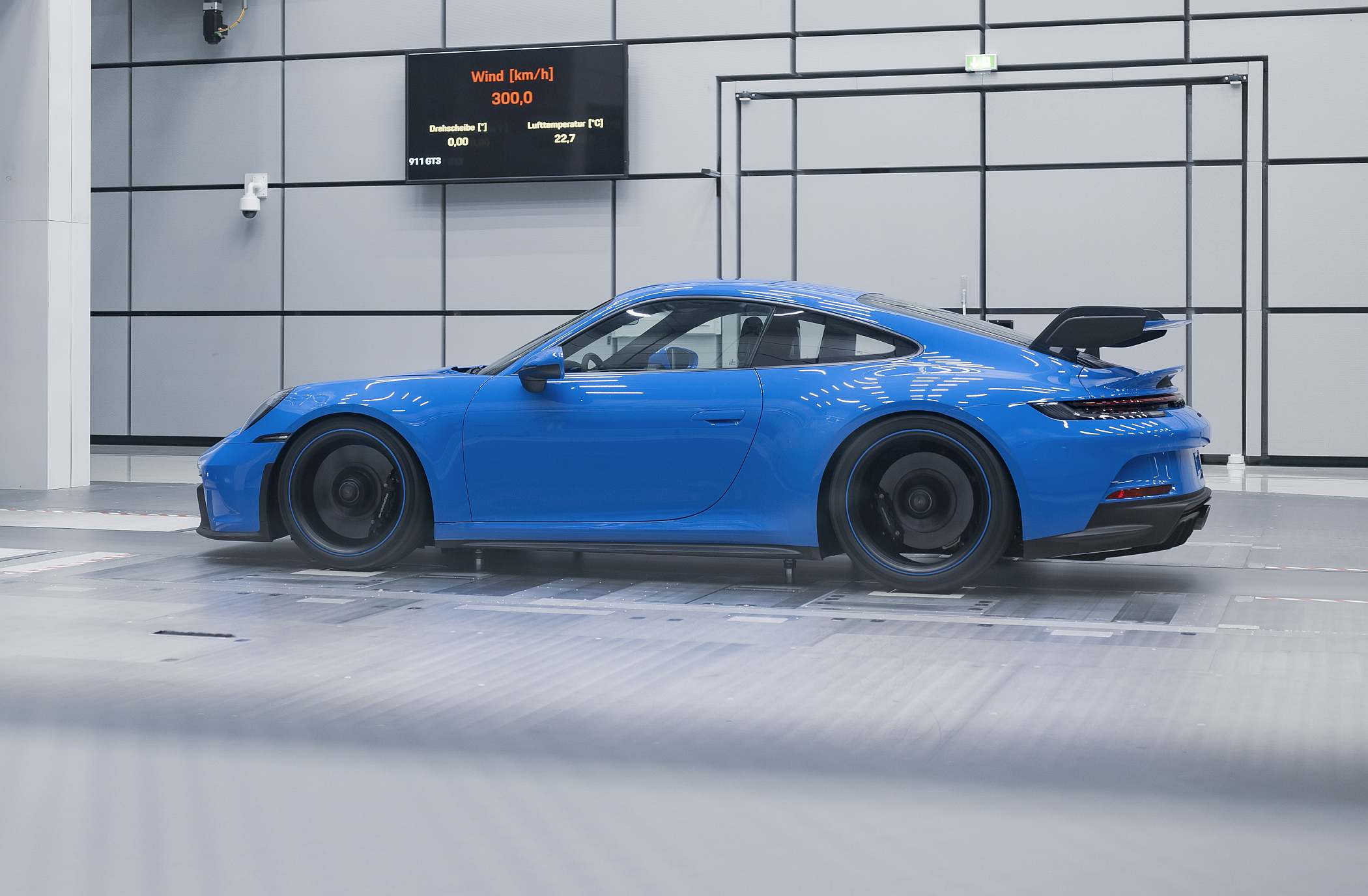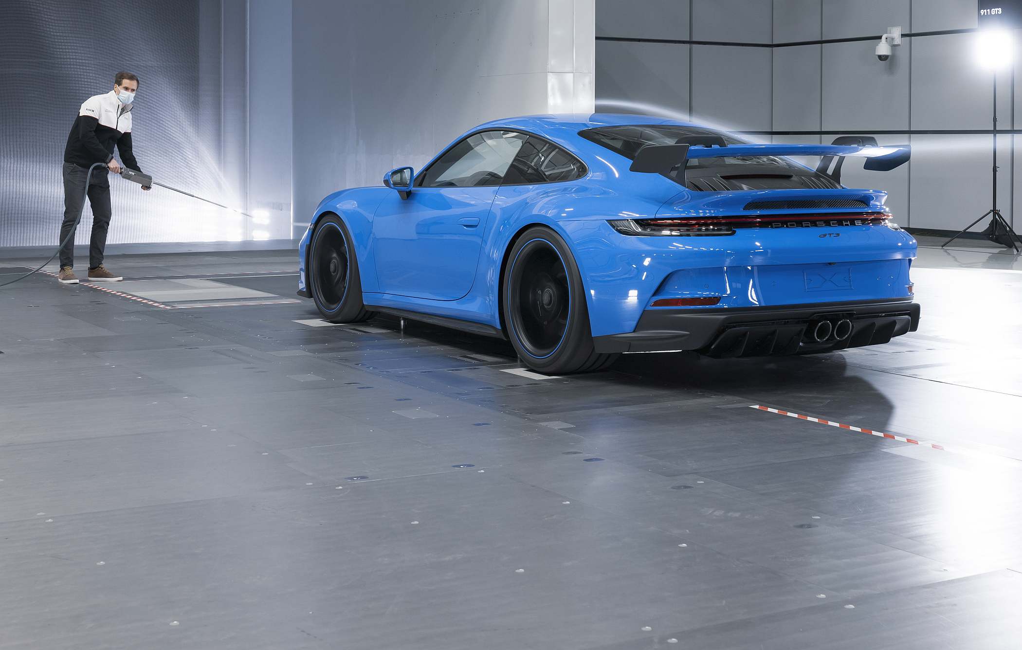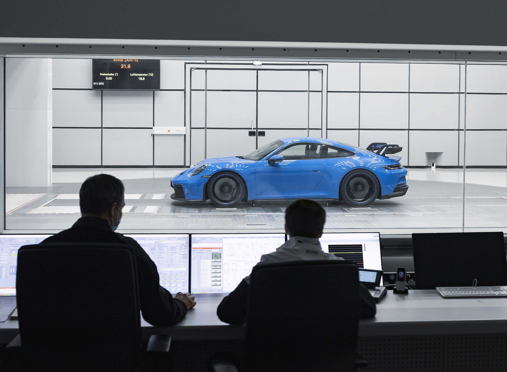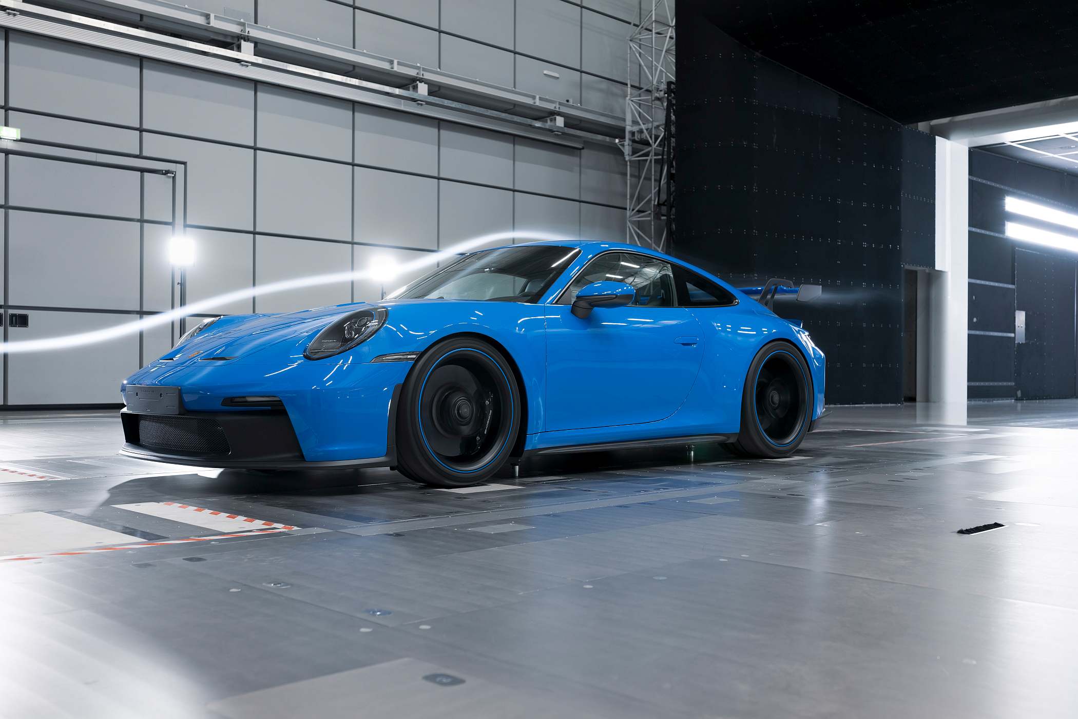“Desenvolvemos a aerodinâmica do novo 911 GT3 em cerca de 700 simulações. Gastámos mais de 160 horas de afinação do carro no túnel de vento”, referiu Mathias Roll, engenheiro de aerodinâmica. “O novo 911 GT3 gera 50% mais de carga aerodinâmica face ao seu antecessor a 200 km/h unicamente no acerto de fábrica. No ajuste de carga máxima, o aumento chega a ser de 150%. No nosso túnel de vento ultramoderno de Weissach, não conduzimos apenas em frente, nós simulamos todas as situações de condução imagináveis”, acrescenta Roll.