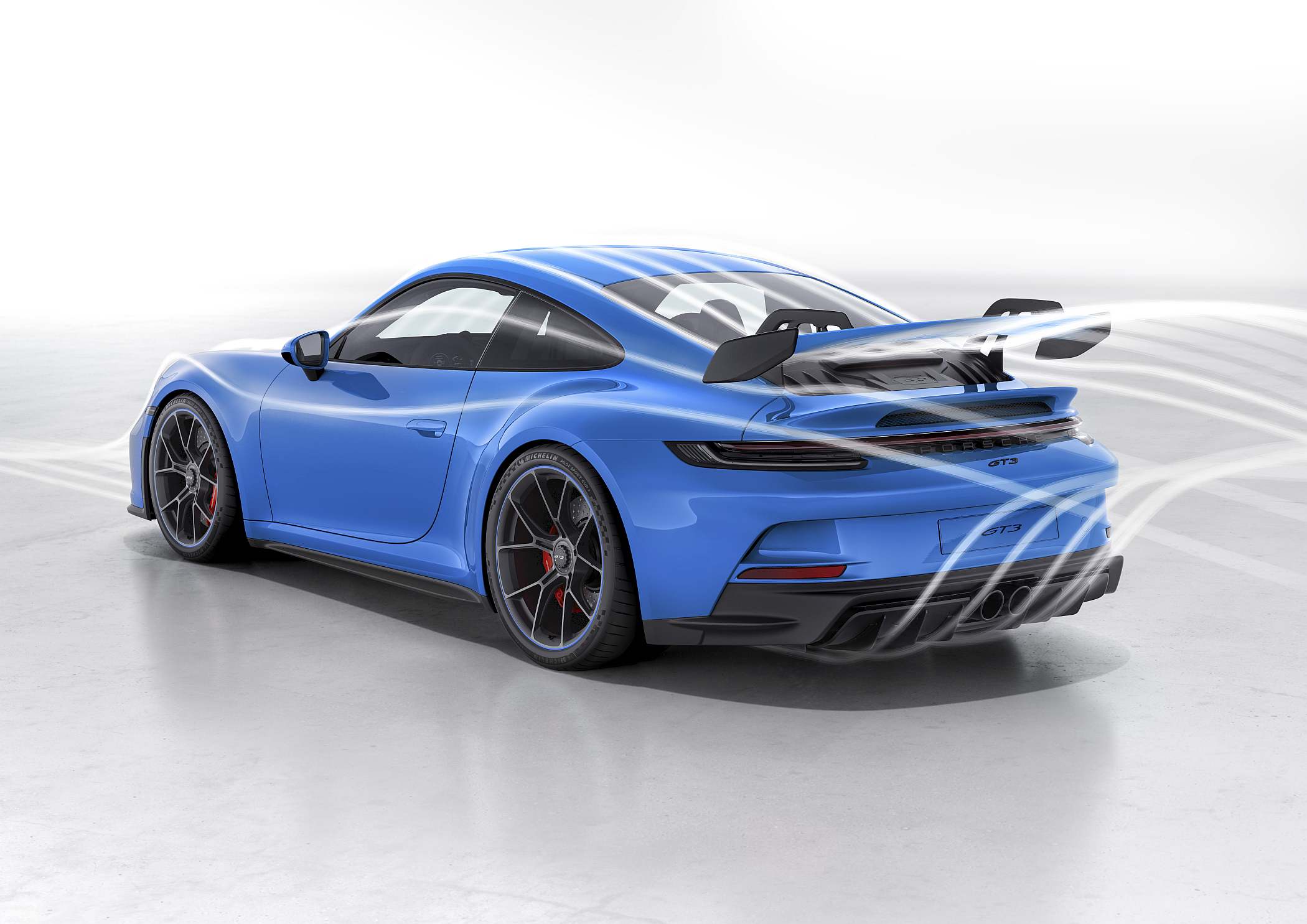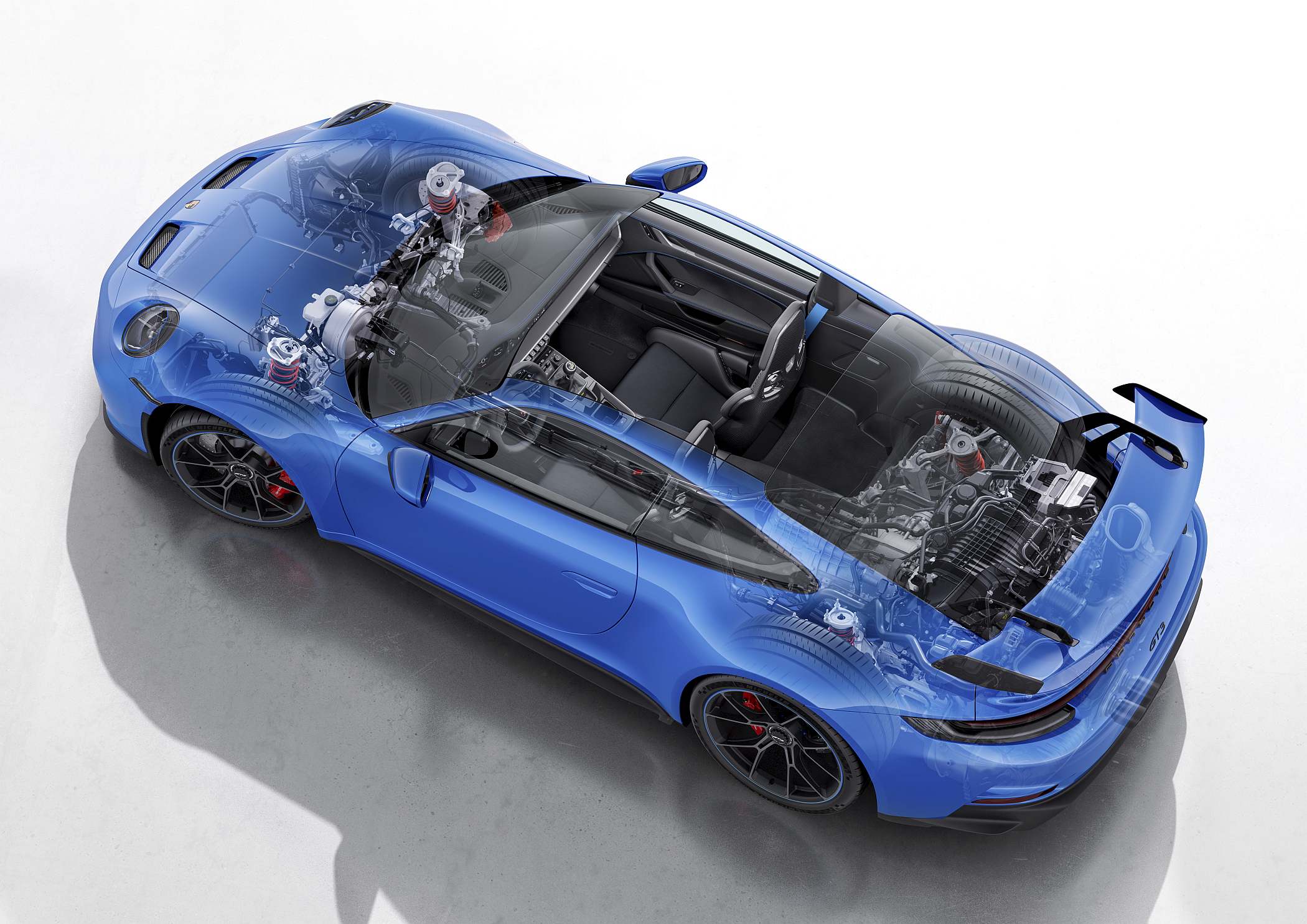 A cooperação entre os departamentos de estrada e o de competição foi bastante estreita neste 911 GT3, com uma transferência direta de tecnologias entre os dois campos. Na área aerodinâmica, a asa suspensa foi aplicada pela primeira vez num carro de produção em série da Porsche, tratando-se de uma asa com suportes ‘pescoço de ganso’, ou seja, em sentido invertido, inspirando-se diretamente no elemento usado no 911 RSR de competição e no GT3 Cup.
