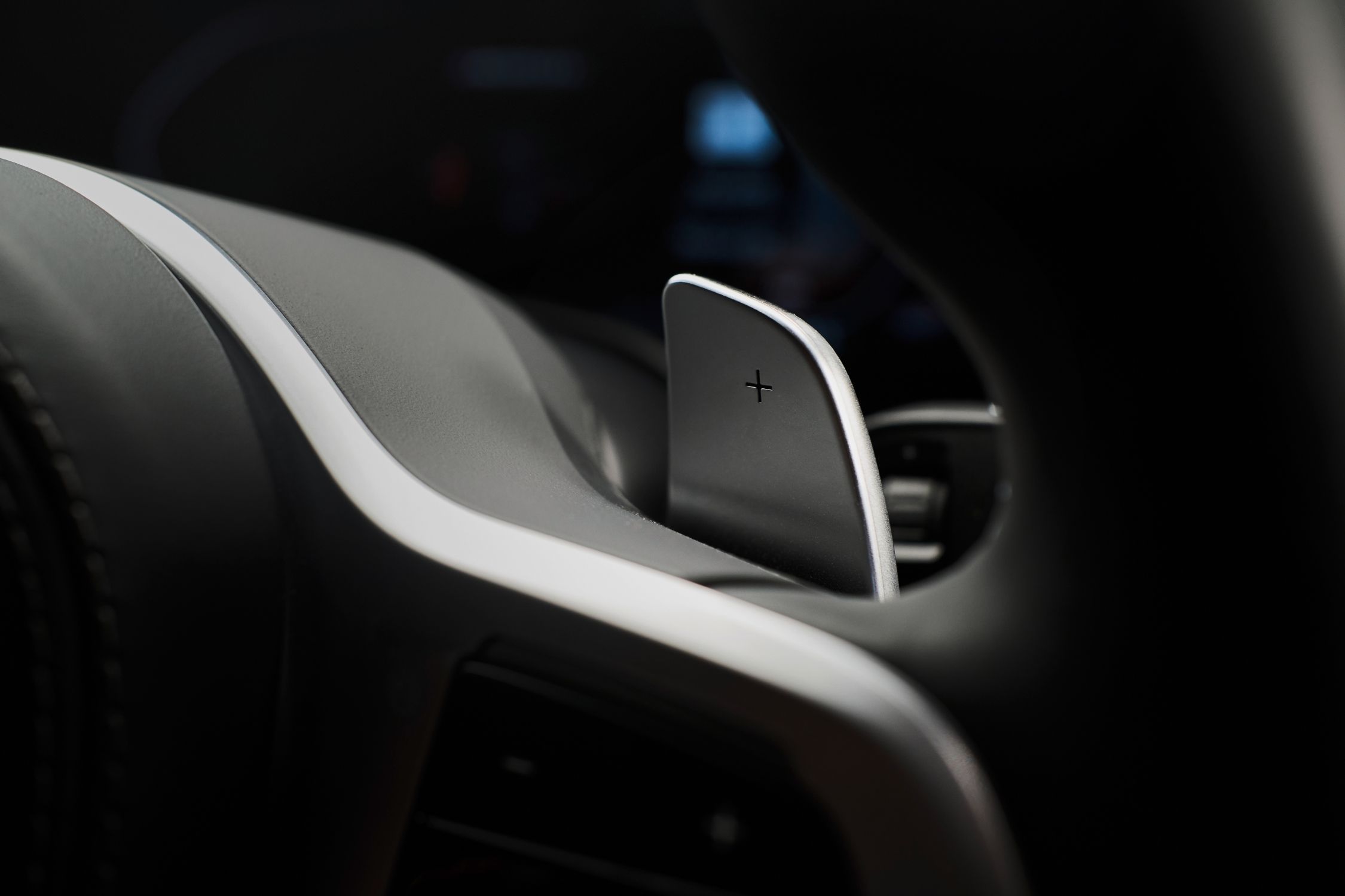 Nas versões M850i xDrive Coupé, M850i xDrive Convertible e M850i xDrive Gran Coupé, o volante desportivo M em pele conta com desenho específico e pespontos decorativos específicos da BMW M GmbH.