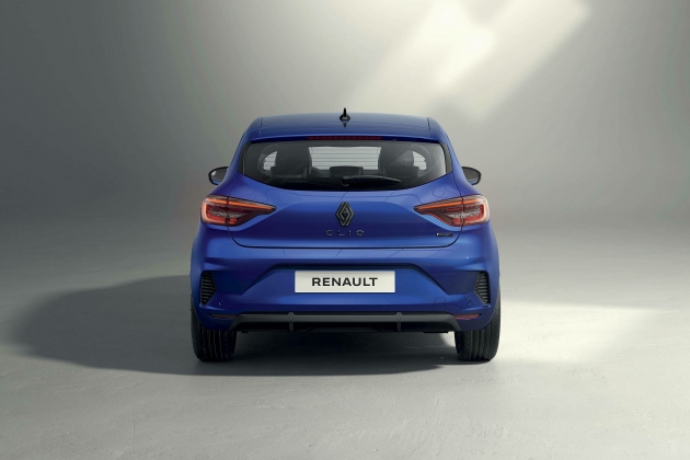 Atrás, o para-choques também foi remodelado, com saídas aerodinâmicas que ampliam visualmente a traseira. O bordo inferior é Preto Mate nos dois primeiros níveis de equipamento, Preto Brilhante na versão Techno e Cinzento Xiste Mate na versão Esprit Alpine. A gama inclui uma escolha de seis difusores (com ou sem saída de escape nas versões híbridas e de acordo com os níveis de equipamento). As modernizadas luzes traseiras incluem, agora, coberturas cristalinas que proporcionam um vislumbre do interior.O novo Clio está disponível em sete cores de carroçaria: Branco Glaciar, Preto Estrela, Cinzento Schiste, Azul Iron, Vermelho Flamme, Laranja Valência e Cinzento Rafale, um novo revestimento de tripla camada que parece sólido à distância e pérola ao perto.