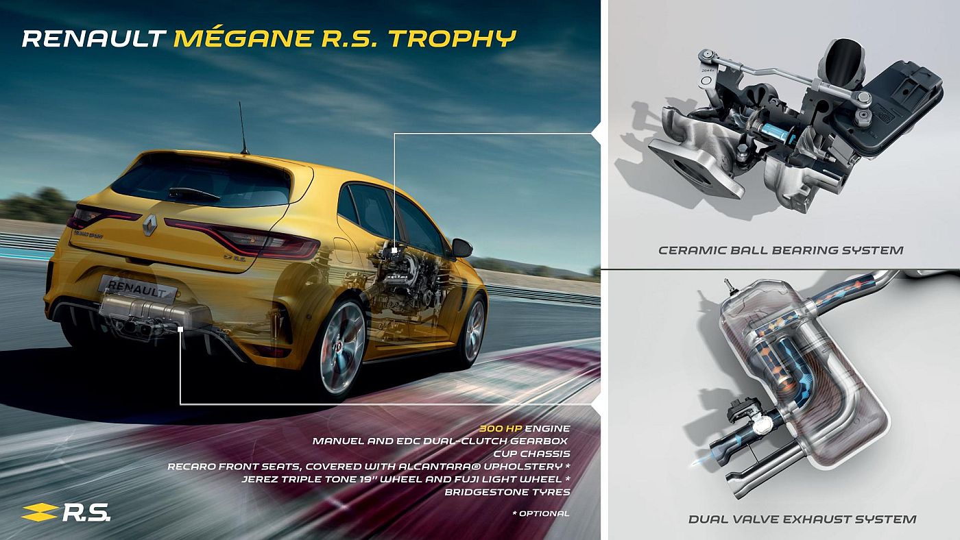 Esta versão é, também, enriquecida com travões de disco dianteiros bimatéria (uma redução de 1,8 kg por roda em termos de massas não suspensas), jantes de 19’’ específicas e um jogo de pneus Bridgestone Potenza S001 de elevado desempenho, que pode ser combinado com novas jantes de liga leve exclusivas. Entre o equipamento opcional, destaque para a nova geração de bancos dianteiros Recaro revestidos a Alcântara. Nota para a inclusão dos vários modos de condução Multi-Sense e para o sistema de telemetria e de recolha de dados R.S. Monitor.