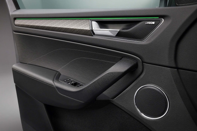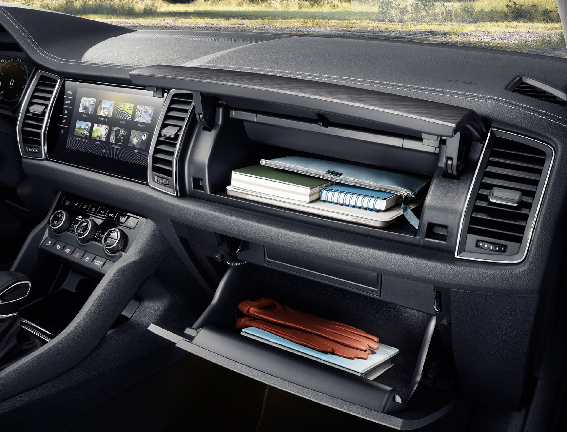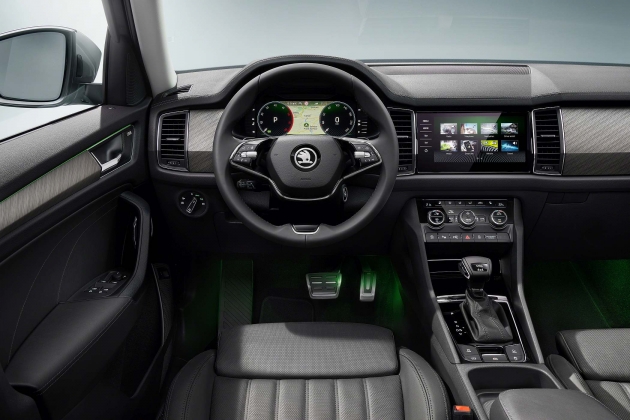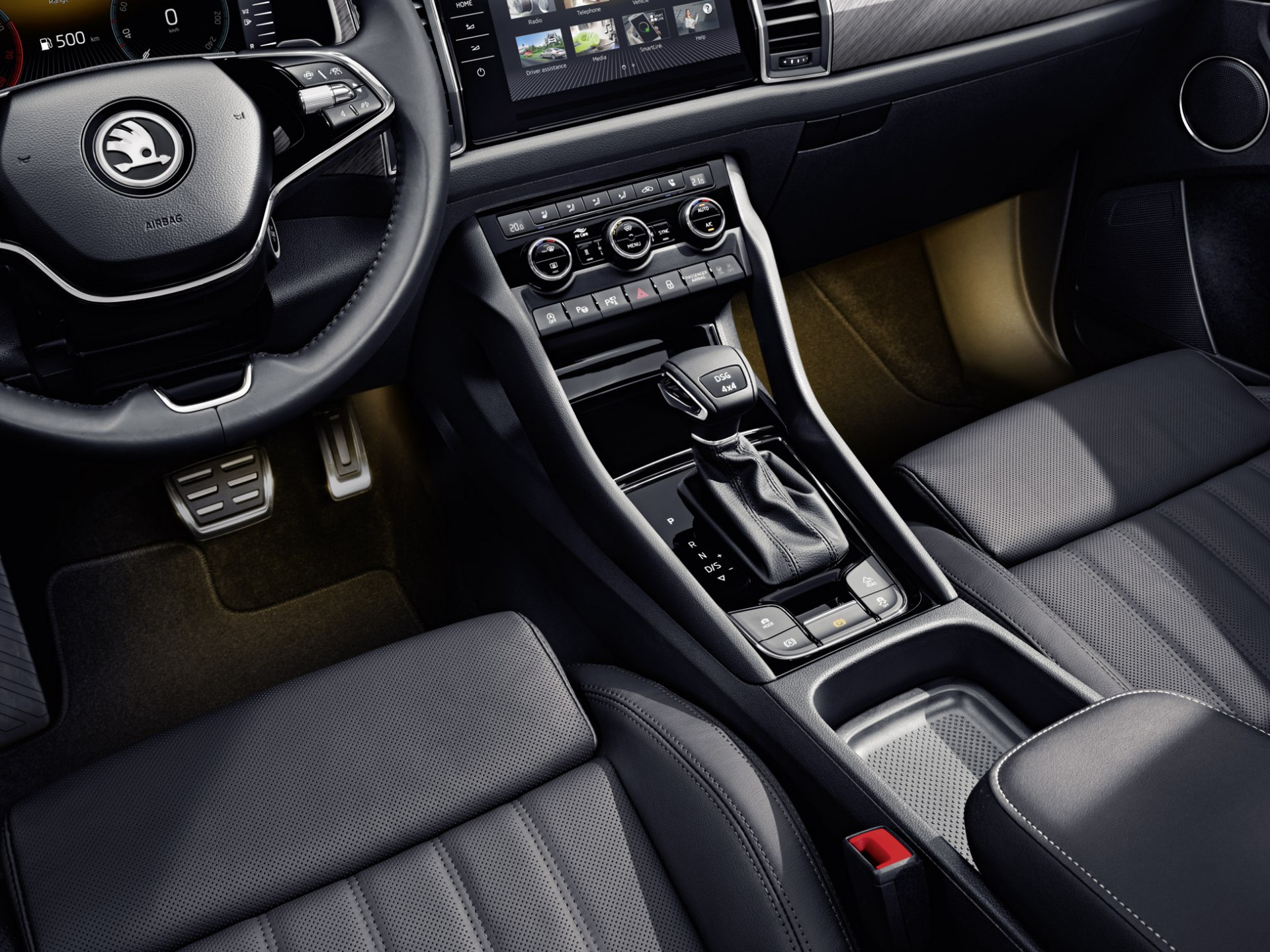 A bordo, as diferenças passam pela oferta de novos revestimentos, com os níveis de equipamento Ambition e Style a oferecerem agora a opção de tecido dos bancos produzido a partir de materiais reciclados, incrementando dessa forma a sua ideia de sustentabilidade. Além de novos elementos decorativos, os clientes poderão também escolher outros revestimentos. Cada nível de equipamento – Ambition, Style, Laurin&Klement e RS – terá características exclusivas. O novo Kodiaq recebe ainda novo volante, embora também diferenciado de acordo com o nível de equipamento. O volante de base de dois braços com controlos cristalinos é aplicado de base, enquanto os mais desportivos Sportline e RS dispõem de volante mais desportivo com três braços.