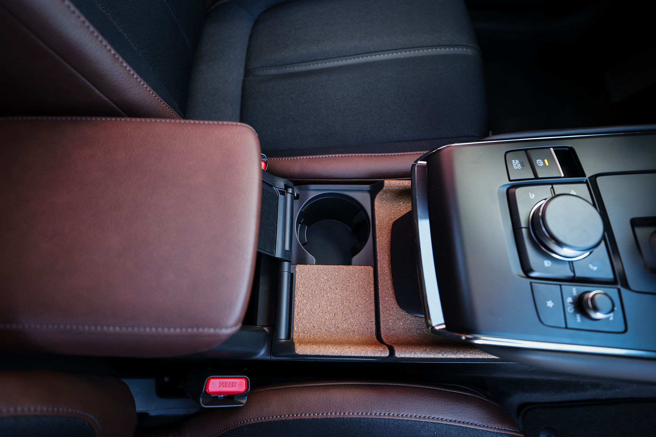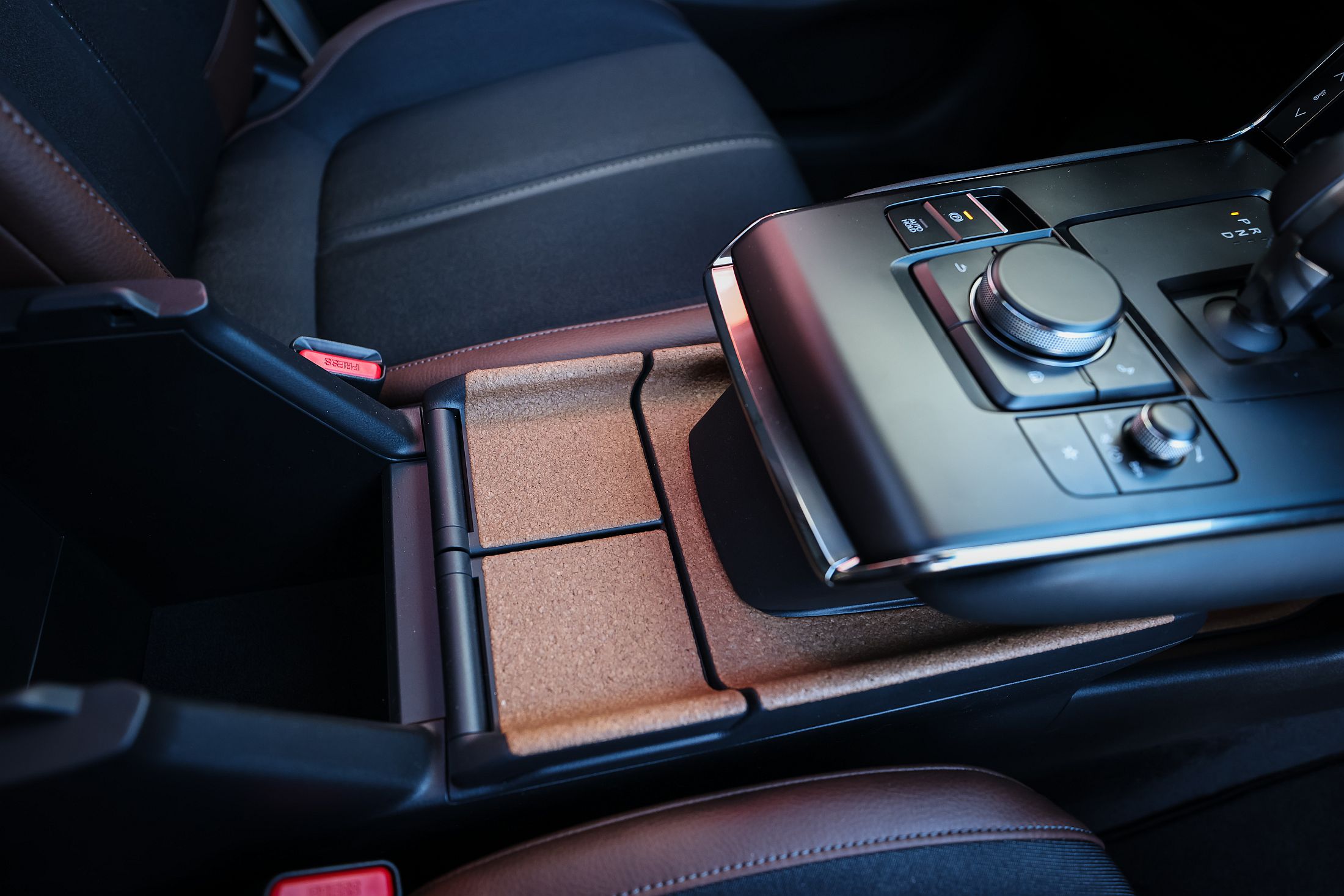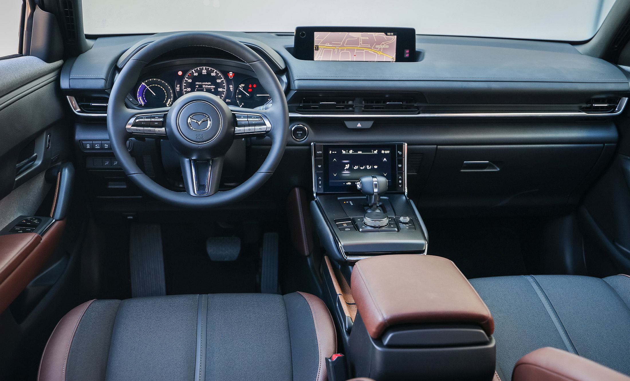 Para quem não sabe, a Mazda nasceu como uma companhia associada à transformação de cortiça no Japão, em Hiroxima, há 101 anos (a pandemia estragou aquelas que seriam as comemorações da marca para o seu centenário em 2020, bem como as da compatriota Suzuki). Assim, no MX-30 homenagem ao passado, mas com um toque luso. Os diversos elementos em cortiça no interior têm proveniência portuguesa. Num ambiente de qualidade que já é habitual na marca japonesa, destacando-se a qualidade de construção e os ajustes de todos os painéis, há três ecrãs a bordo, um para o painel de instrumentos (bastante limitado e enquadrado em elementos analógicos), outro ao centro para o sistema de infoentretenimento (que não é tátil e é apenas controlado pelo comando rotativo no túnel central entre os bancos dianteiros) e outro pouco abaixo, que serve de comando central para a climatização.