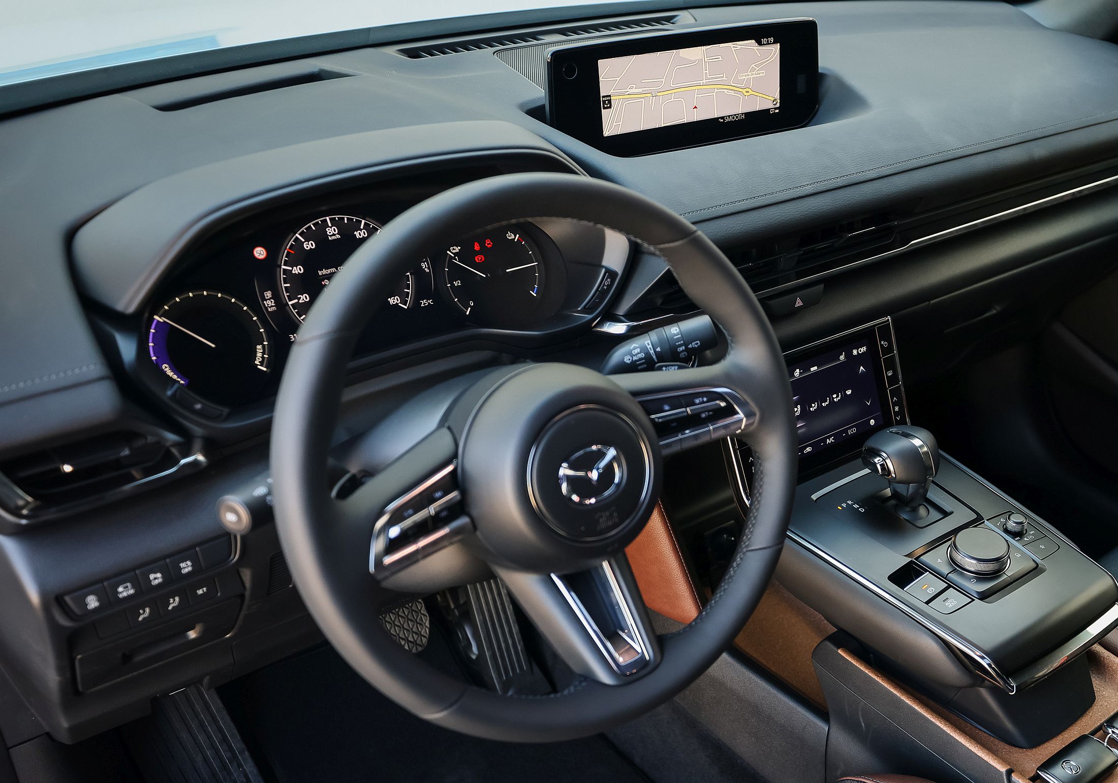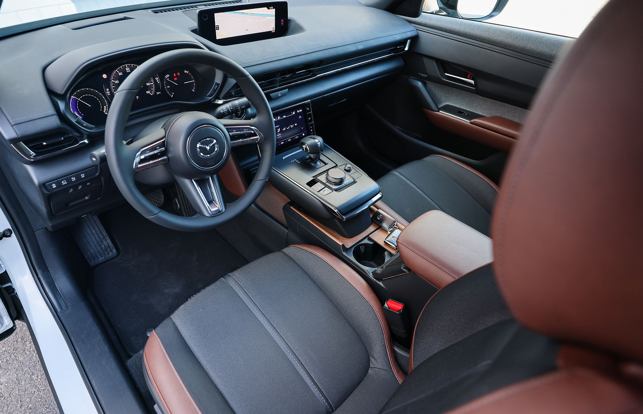 No lado do consumo e dos carregamentos, a marca aponta um consumo energético homologado de 19.0 kWh/100 km, mas no nosso ensaio, aproveitando as patilhas da regeneração e com uma parte do mesmo feito sob chuva copiosa, obteve-se um valor bem mais interessante e que pode ser replicado de forma fácil: 15.3 kWh/100 km. Mas, tal como sucede noutros modelos, como o Honda e ou o smart EQ forfour, os benefícios de uma bateria mais pequena surgem no momento de carregar, sendo preciso apenas três horas para carregar de 20 a 80% numa wallbox de 7.4 kW. Todavia, como o carregador de bordo do MX-30 é de apenas 6.6 kW, o carregamento em corrente alternada (AC) está limitada a esse valor, mesmo que a wallbox seja de maior potência. No caso de um ponto de carga DC, pode carregar a um máximo de 50 kW, com que demora cerca de 40 minutos no mesmo processo (convém recordar que os últimos 20% são mais demorados de carregar). Se tudo falhar, pode sempre ligar a uma tomada doméstica, na qual, a 2.3 kW, demorará cerca de 14 a 15 horas para obter uma carga completa.