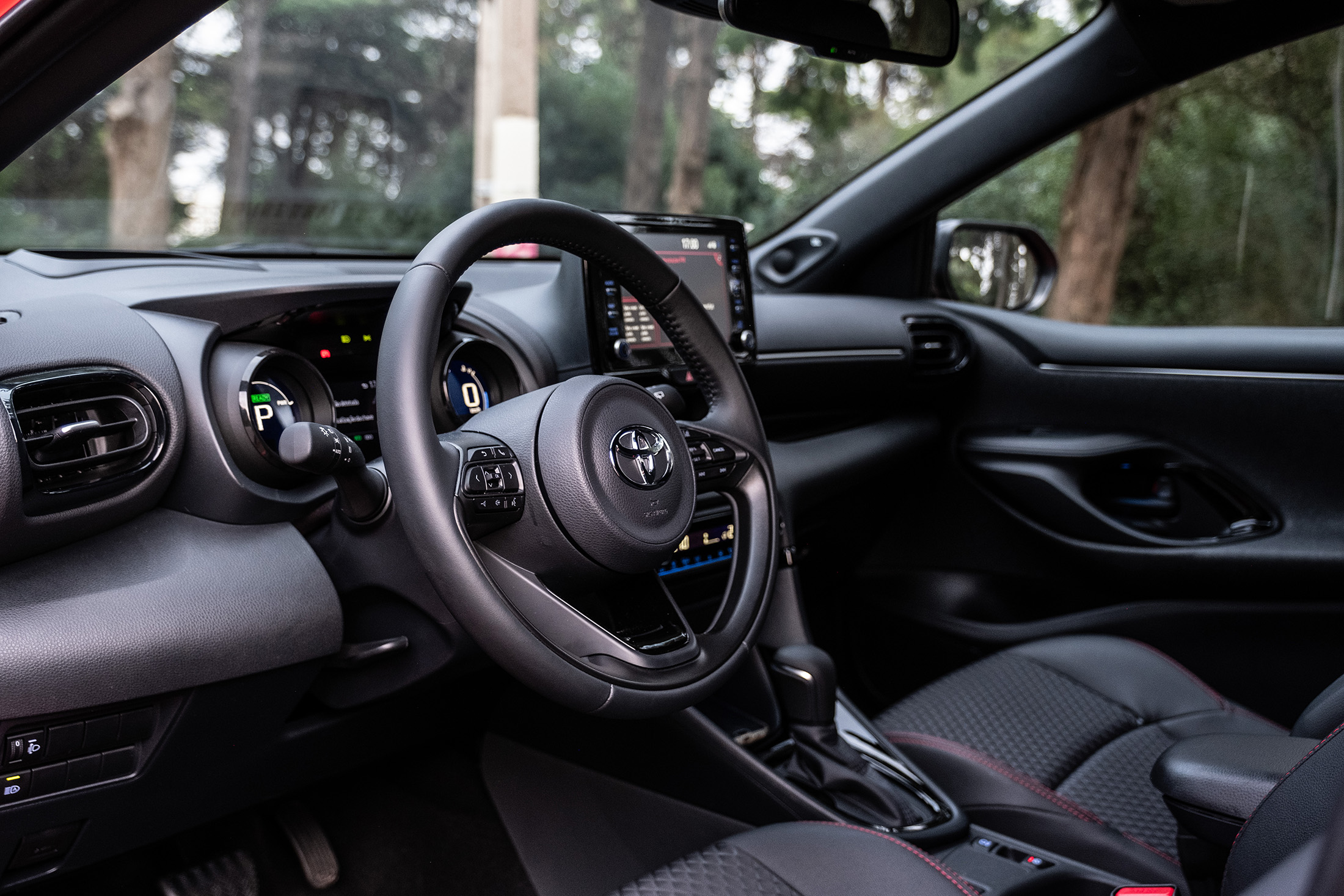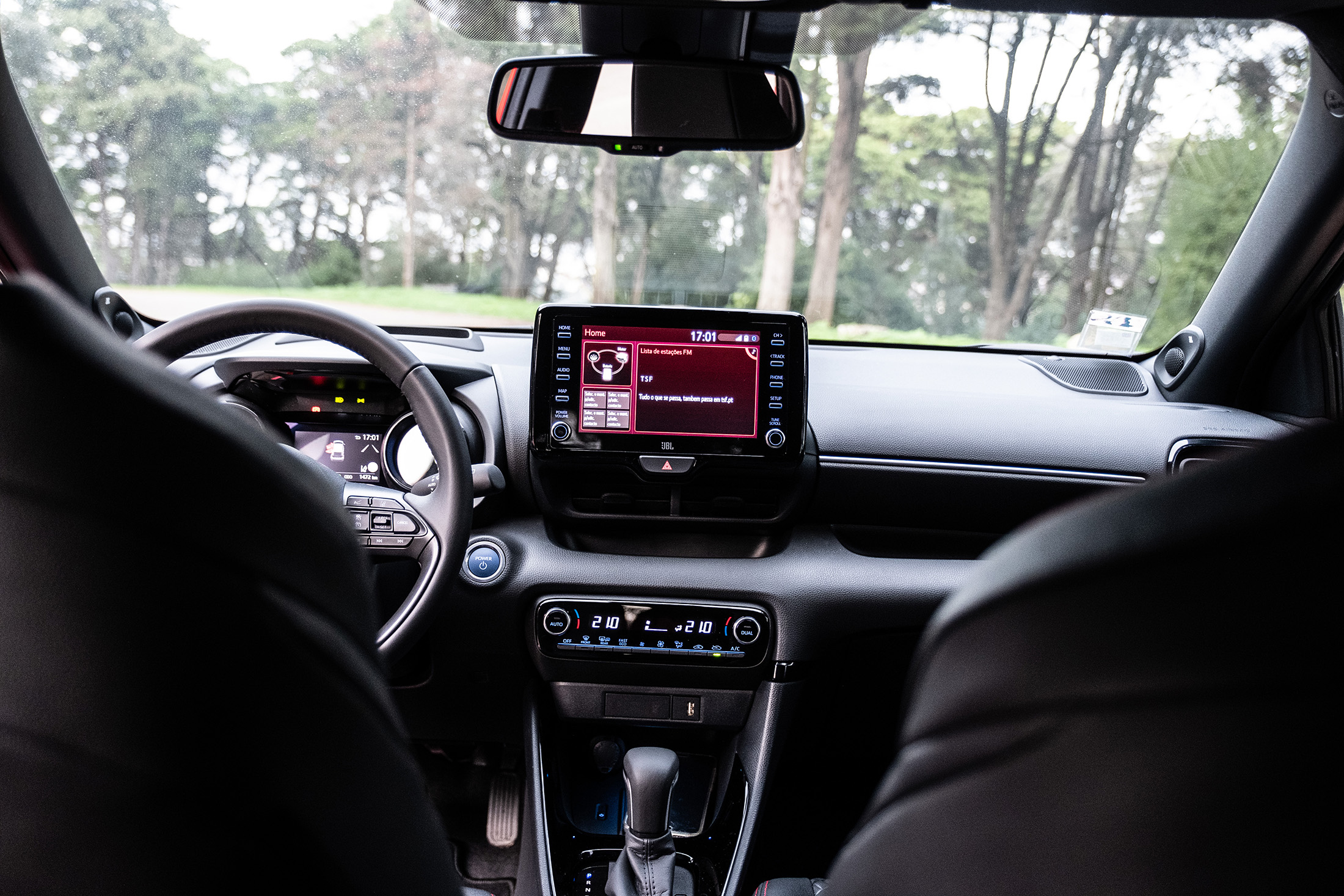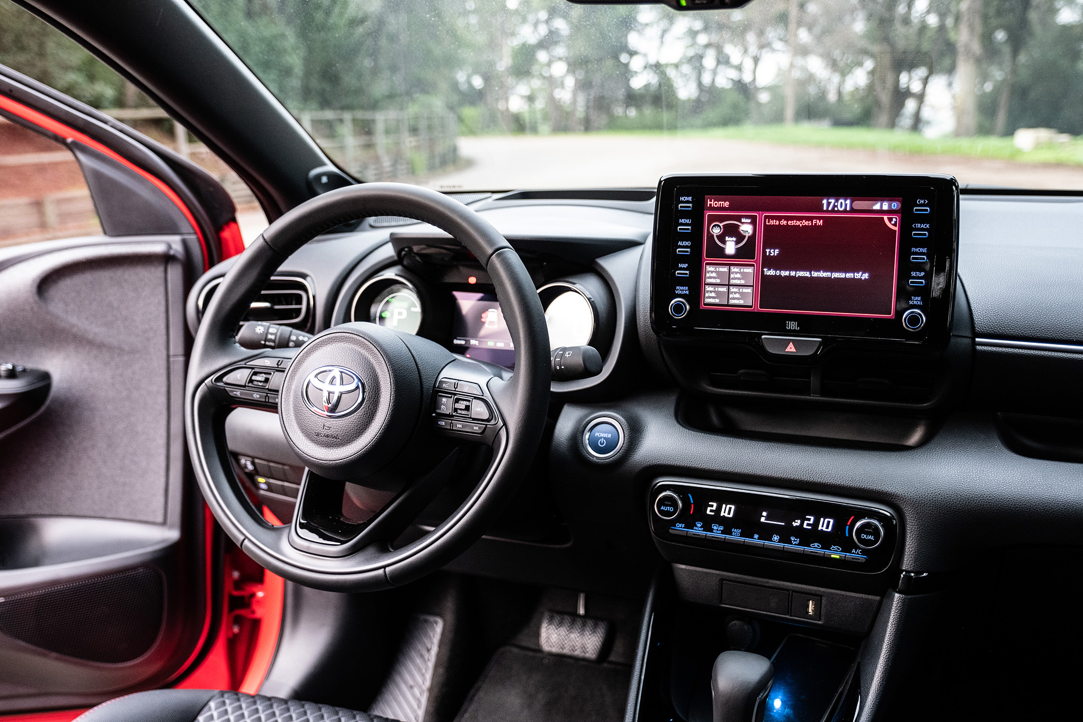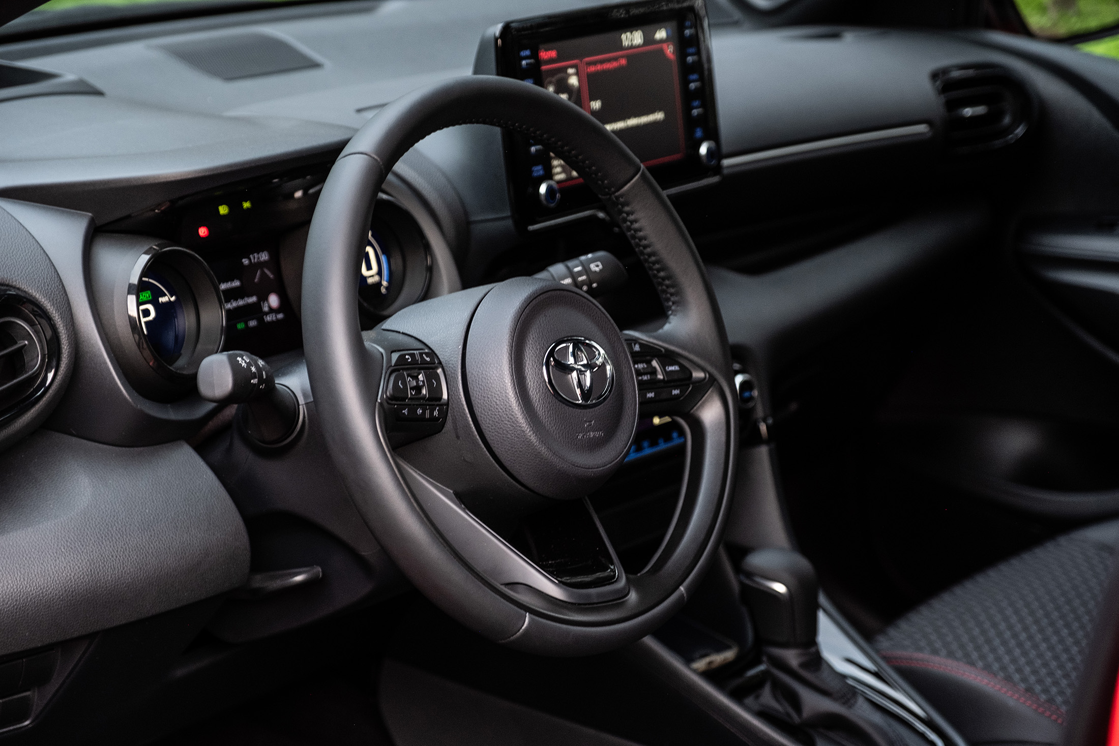 No centro do tablier está o ecrã tátil de infoentretenimento que, felizmente, tem botões físicos para acesso às funções – a Toyota continua a insistir num interface pouco intuitivo e claramente ultrapassado. A eliminação de distrações durante a condução são uma prioridade no novo Yaris e para esse fim temos um “head-up display” que projeta a informação essencial no para-brisas. Chegamos ao preço. 25 990€ para a versão testada que se justifica pelo equipamento incluído: Android Auto e Apple Car Play, vidros escurecidos, ar condicionado automático bizona, bancos desportivos em tecido e pele sintética, sensores de luz e chuva, câmara de marcha atrás, travão elétrico, sistema de som JBL com oito colunas, volante multifunções em pele, faróis LED para iluminação e circulação diurna, luzes de nevoeiro e óticas traseiras, máximos automáticos, reconhecimento de sinais, head-up display projetado, cruise control adaptativo, aviso de saída de faixa, travagem de emergência, sistema pré-colisão, jantes de 17 polegadas maquinadas, e ainda um tejadilho panorâmico, que é uma pena ser tão difícil abrir e fechar a sua cobertura.