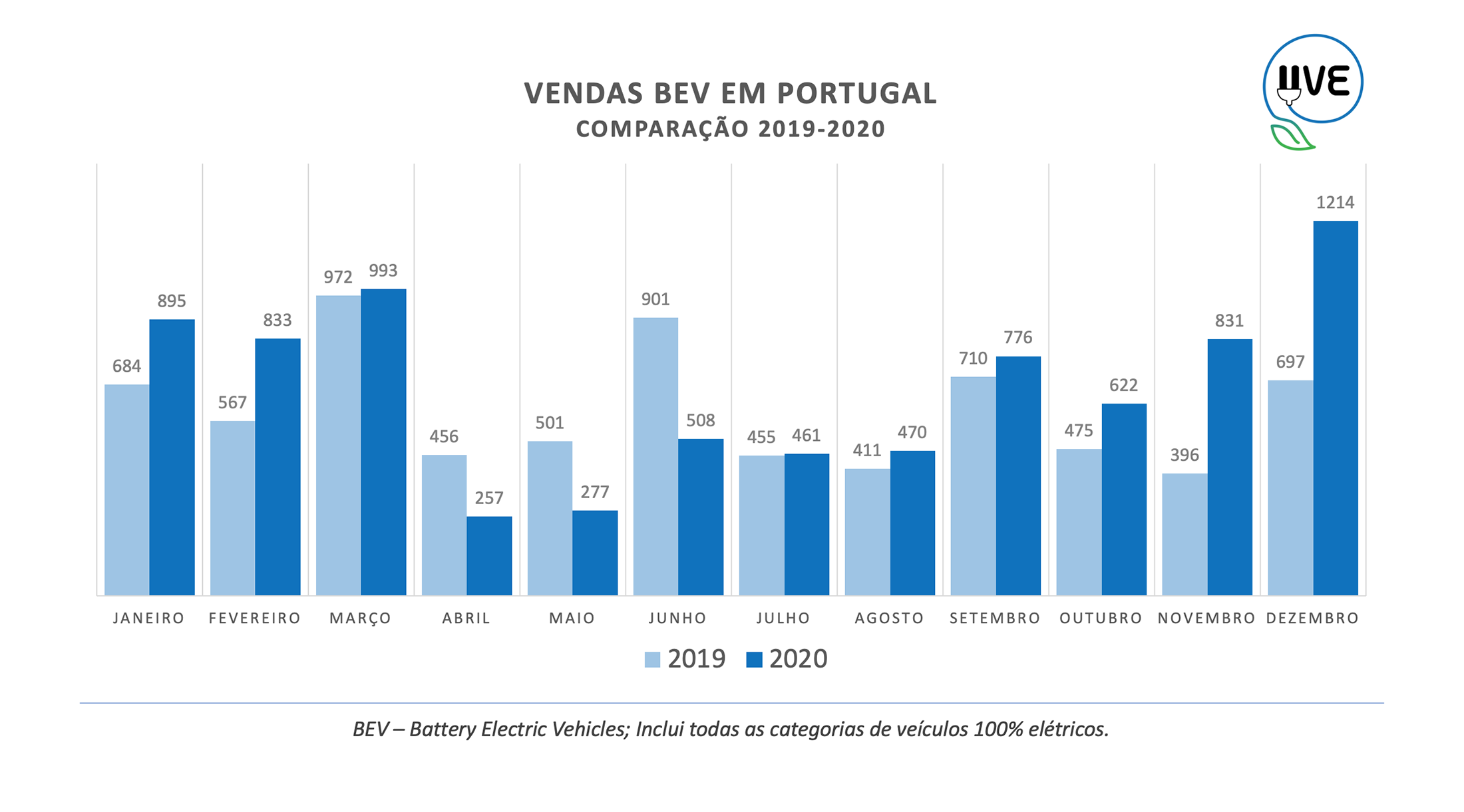Numa análise exclusiva às vendas dos veículos 100% elétricos (BEV), a UVE assinala que, após quatro meses de quedas, fruto do estado de emergência em que o país viveu, as vendas dos BEV registaram uma forte recuperação, atingindo um aumento de 126% em novembro e de 71,4% em dezembro, tendo havido subidas em oito dos doze meses.