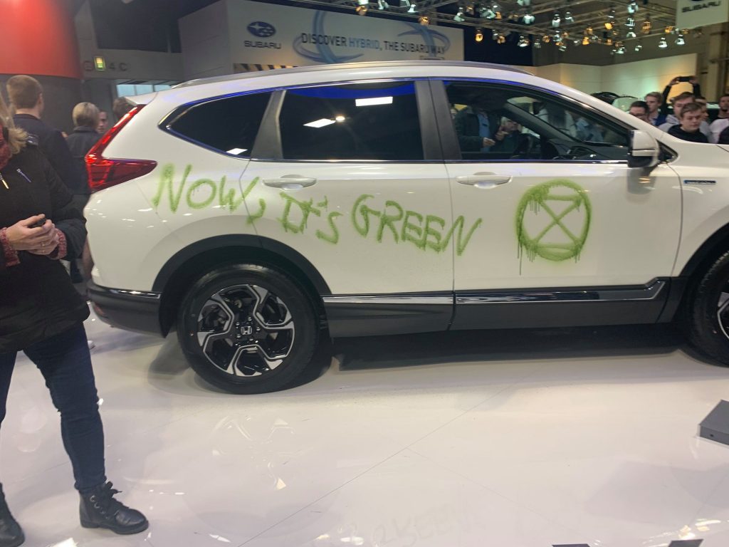 Antes, nas redes sociais, os organizadores da ação de protesto divulgaram a intenção de boicotar o evento que apelidaram de “salão das mentiras” e, durante os dias de exposição, foram muitas as intervenções, desde cartazes cirurgicamente colocados nos acessos às instalações, sangue falso derramado sobre os carros nos expositores ou “coreografias de grupo”, com dezenas de pessoas deitadas no chão do salão, fingindo-se de mortas, vítimas da poluição.