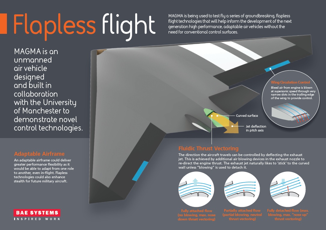 Criado pela BAE Systems com ajuda da Universidade de Manchester, o Magma utiliza duas novas tecnologias trabalhando em conjunto para manobrar a aeronave. A primeira é o Controlo de Circulação da Asa, que direciona ar expelido pelo motor sobre a asa para assegurar o controlo. Para mudar de direção, existe o sistema de vetorização de impulso fluído, que lança ar por outro para outro orifício para interferir com o escape do jato. A turbulência é suficiente para mudar a direção da aeronave.