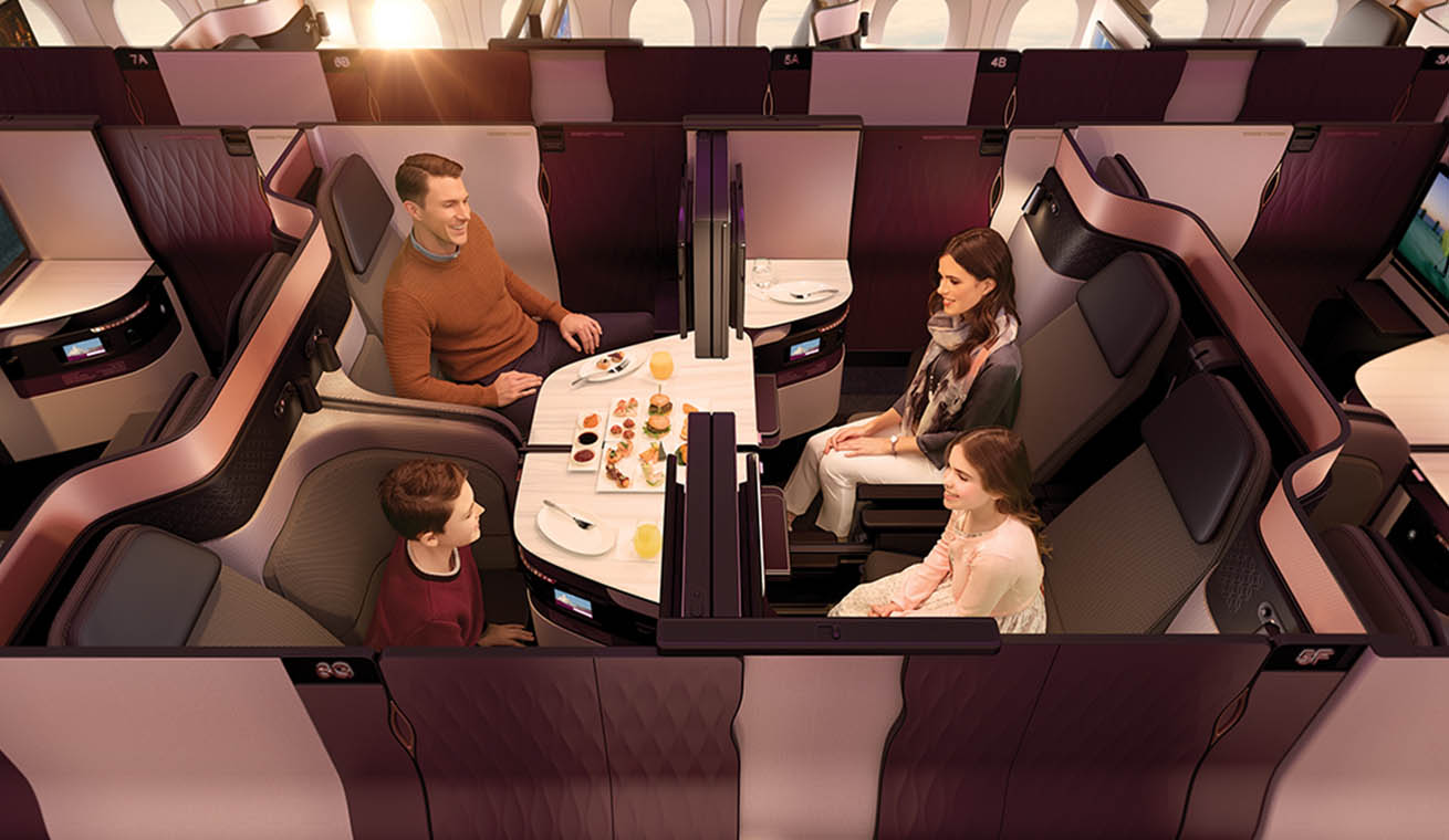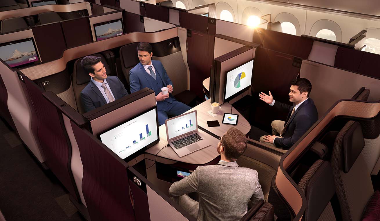 Com a Qsuite, até quatro pessoas podem viajar em grupo e conversar, com a disposição dos assentos de costas para a direção do voo. Existe um painel com comandos media, que lhe permite usar conexões de vários tipos, incluindo USB e HDMI. As mesas podem ser usadas para trabalho e para refeições e o espaço é comprido o suficiente para cada banco ser transformado numa cama. E cada lugar individual tem um separador para privacidade adicional.