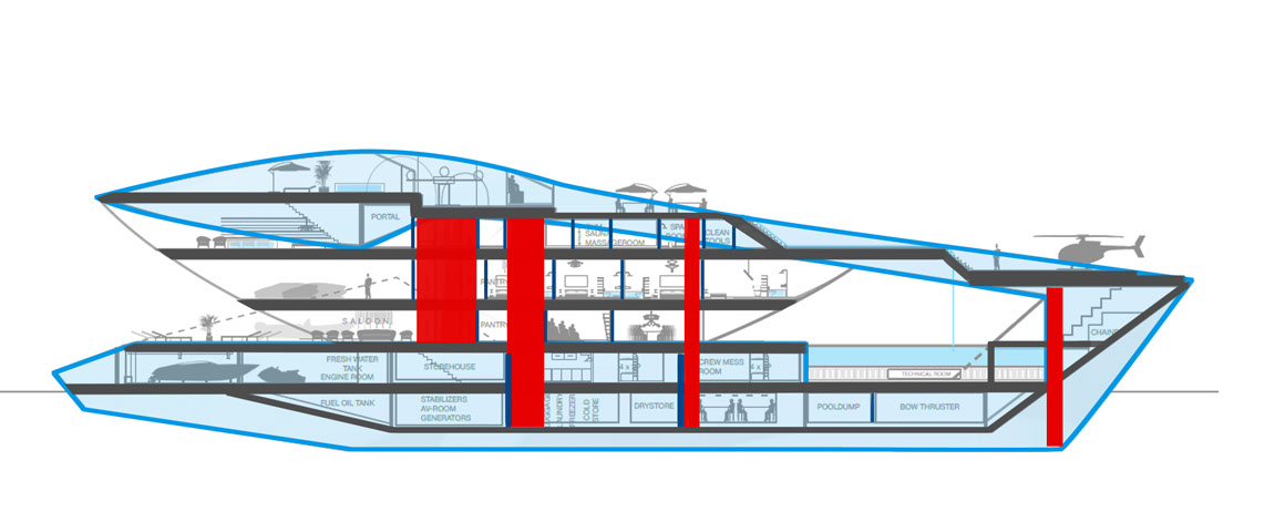 Mas se o iate seria incrivelmente caro, então iria necessitar de mais excentricidades. Mas a Sea Level não desilude nesse aspeto, instalando uma piscina exterior no andar de baixo, um heliporto e até um parque para os automóveis dos passageiros, exposto para ser admirado quando estivesse ancorado no porto.