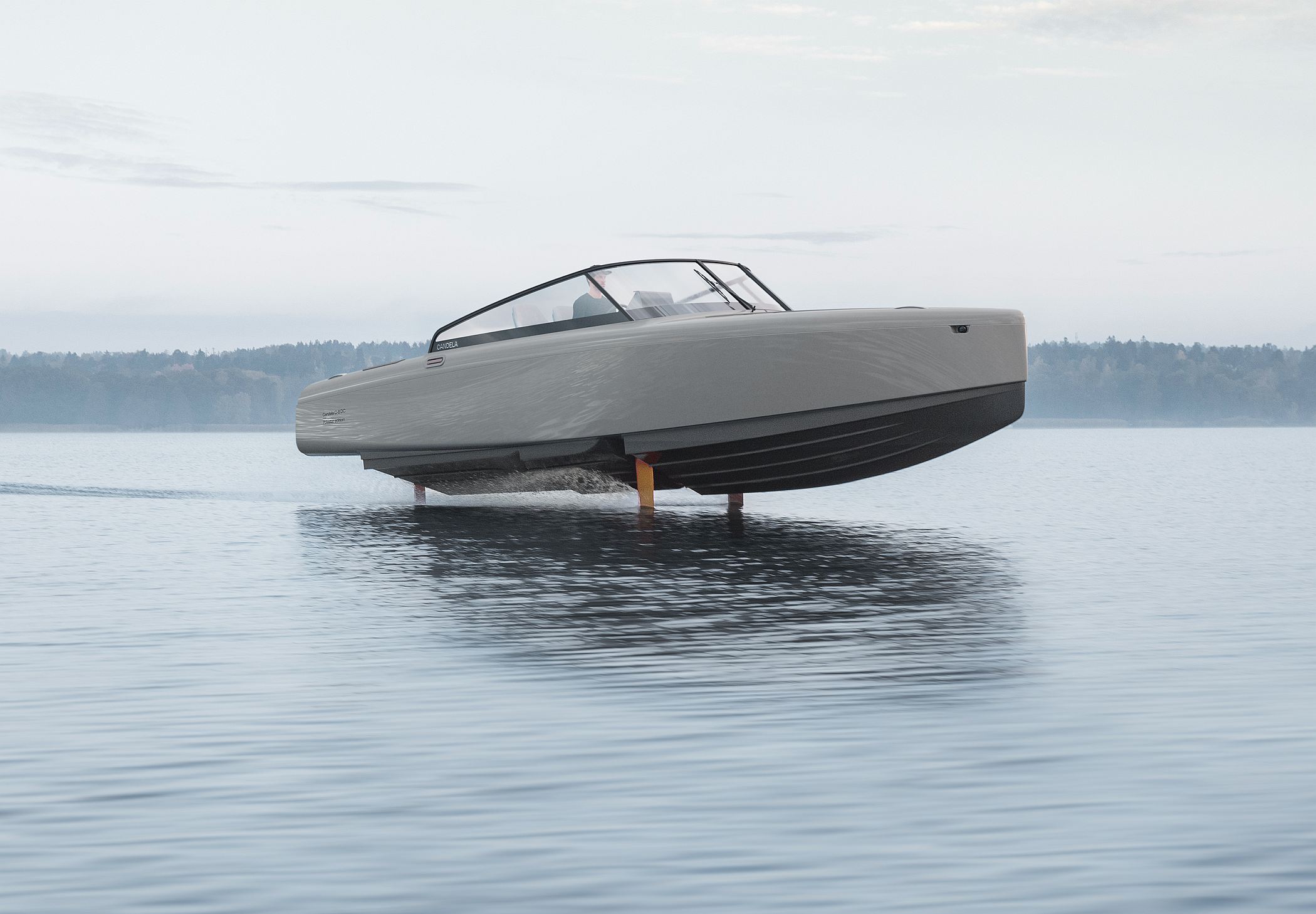 No caso da imagem, as sugestões de design personalizado incluem uma nova cor cinzenta-clara sólida, estofos dos bancos especialmente concebidos e hidrofólios pintados no icónico “swedish gold”. Uma nova cor exterior cinzenta sólida complementada por um tom cinzento mais claro nas áreas interiores dá ao barco um aspeto elegante e uniforme que é reforçado pela utilização do mesmo tecido certificado em todo o lado, desde os assentos às almofadas e espreguiçadeiras passando pelos painéis das paredes e pelo tejadilho.