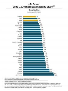 No ranking de qualidade e satisfação elaborado nos Estados Unidos, a Genesis ocupa o lugar mais alto com uma pontuação de 89 em 100. A Lexus ocupa o segundo lugar da tabela, ao obter 100 pontos; a Buick (103) encerra o pódio.