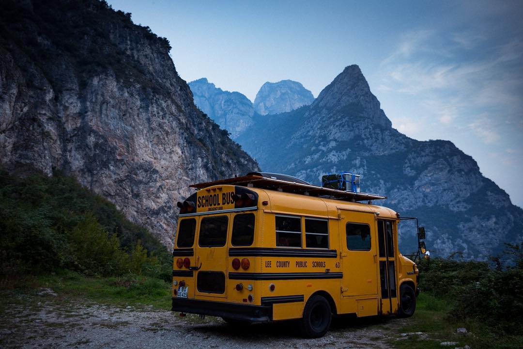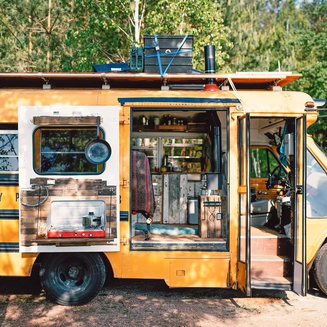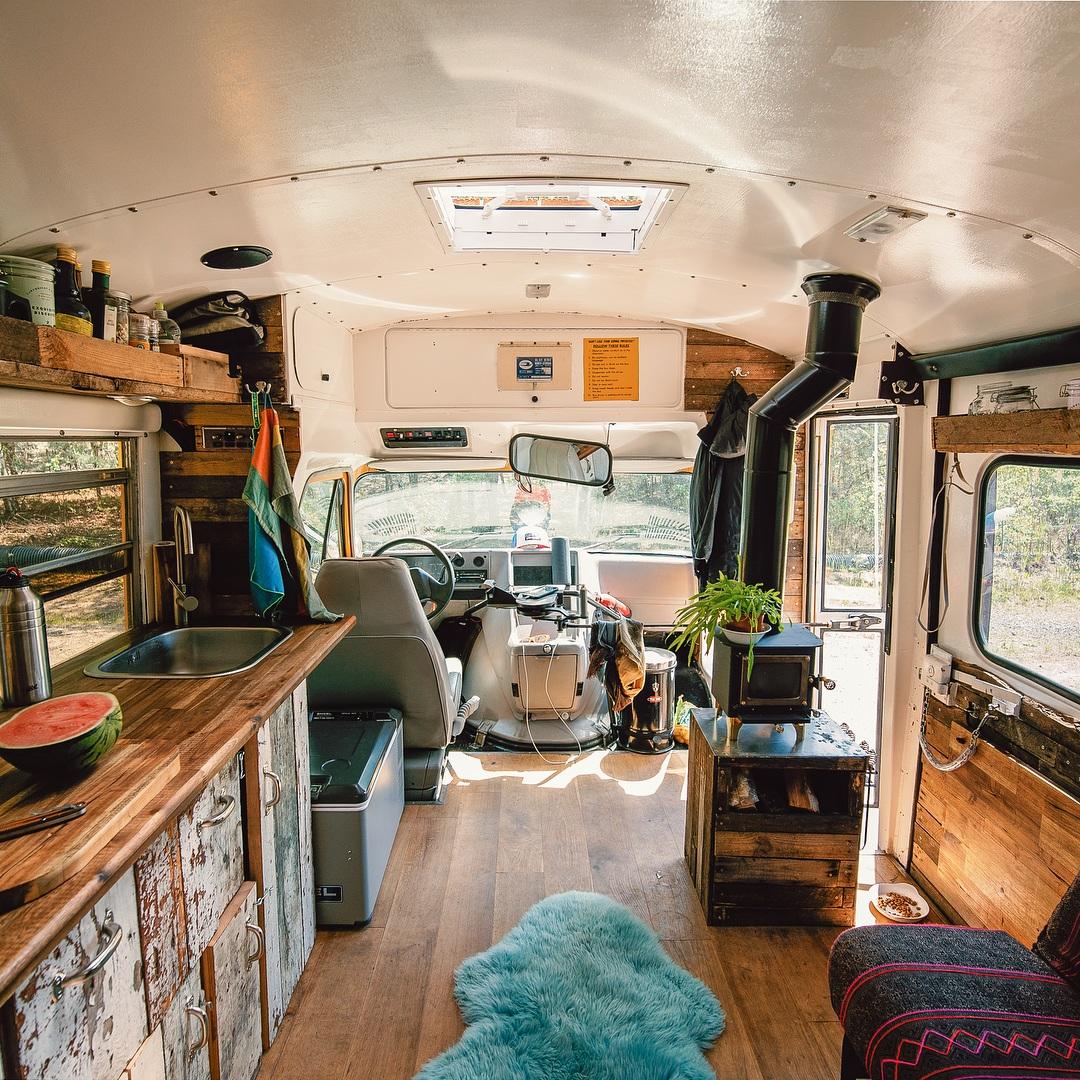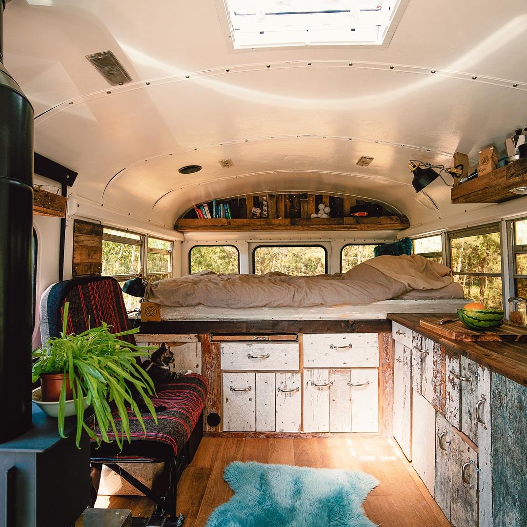 Ao contrário de outras autocaravanas, o autocarro escolar GMC tem bastante luz, já que Julie e Kai conseguiram manter todas as janelas sem ter que tapar nenhuma. A sala de estar e de jantar está montada ao lado da cozinha, com a cama montada na traseira, e uma porta de segurança que abre para trás. Os últimos três anos foram passados quase sempre na estrada, à procura da melhor onda para fazerem surf. Primeiro, vieram a Espanha e Portugal. Depois, passaram algumas semanas na Itália, antes de regressarem à Alemanha para comprar equipamentos novos e aparecerem num livro de viagens. Só há uma coisa que Kai acha chato: ter que passar muito tempo a reabastecer o motor V8 a gasolina.