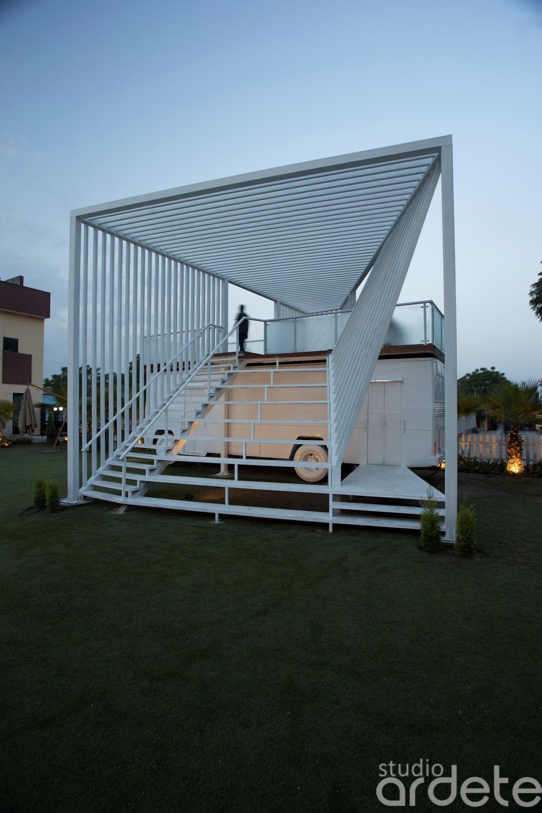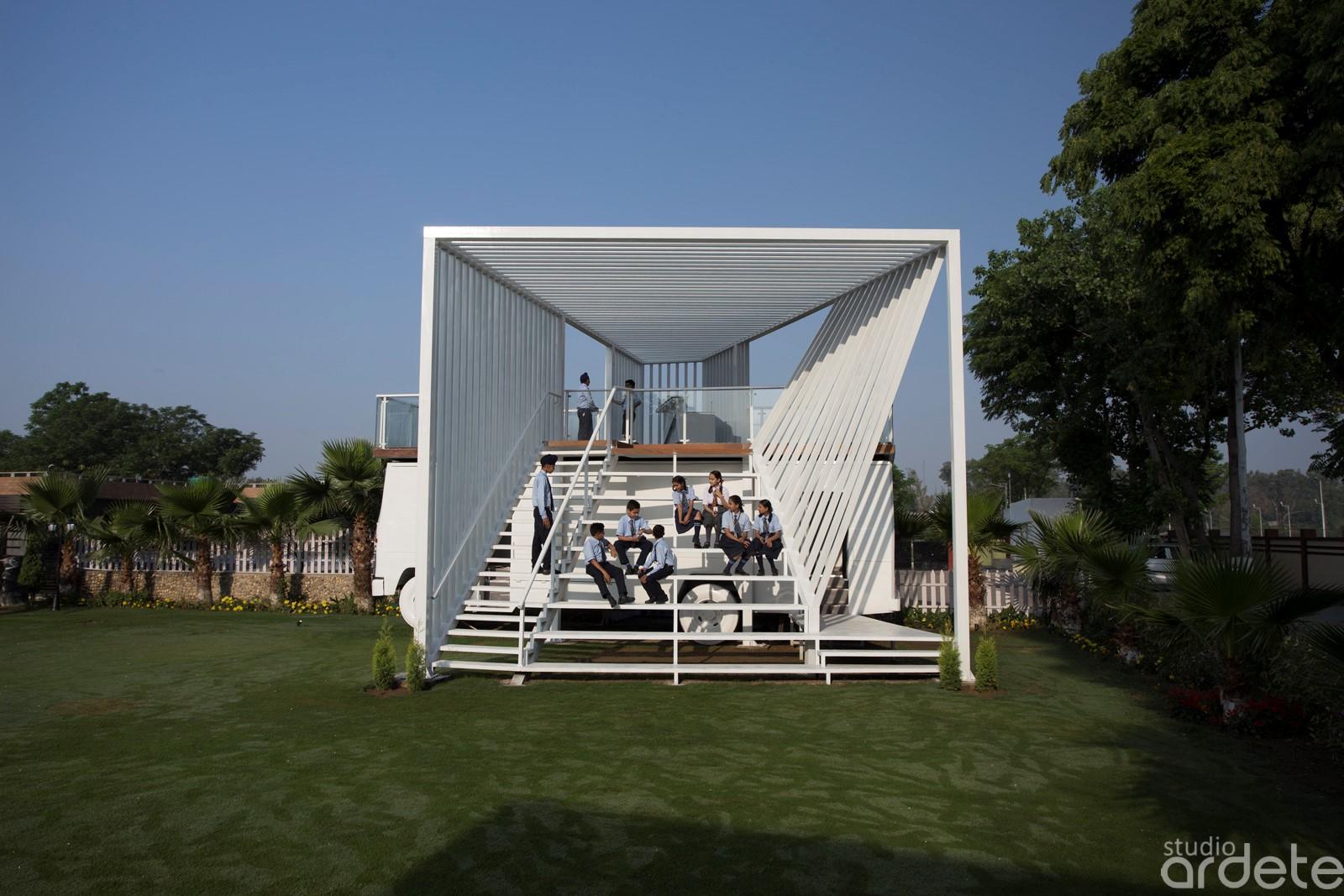O autocarro escolar Greyhound, que já era velho quando foi importado dos Estados Unidos, esteve ao serviço da Escola Pública de Doaba (seguindo a convenção britânica, escolas “públicas” são o que chamamos “privadas”), no Punjab, um estado do norte da Índia. Como o corpo docente e os alunos ficaram com um apego emocional ao autocarro, a administração da escola resolveu pedir ao Studio Ardete para transformar o autocarro em algo útil. A resposta do estúdio foi integrar o autocarro na estrutura da escola, chamando-lhe Bavillion.