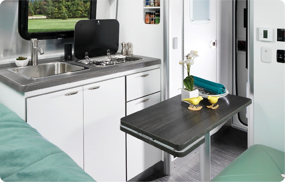 A cozinha tem espaço para um fogão de dois bicos e microfone, guardando também as mesas em alumínio, que podem ser recolhidas e escondidas facilmente. Entradas USB podem ser usadas para carregar aparelhos eletrónicos, e há também espaço para arrumação de objetos junto ao teto. Lâmpadas em LED, cortinas escurecidas e colchão de espuma são opcionais. Embora tenha retrete no interior, o duche está montado do lado de fora. O preço começa nos 45.900 dólares (37.100 euros).