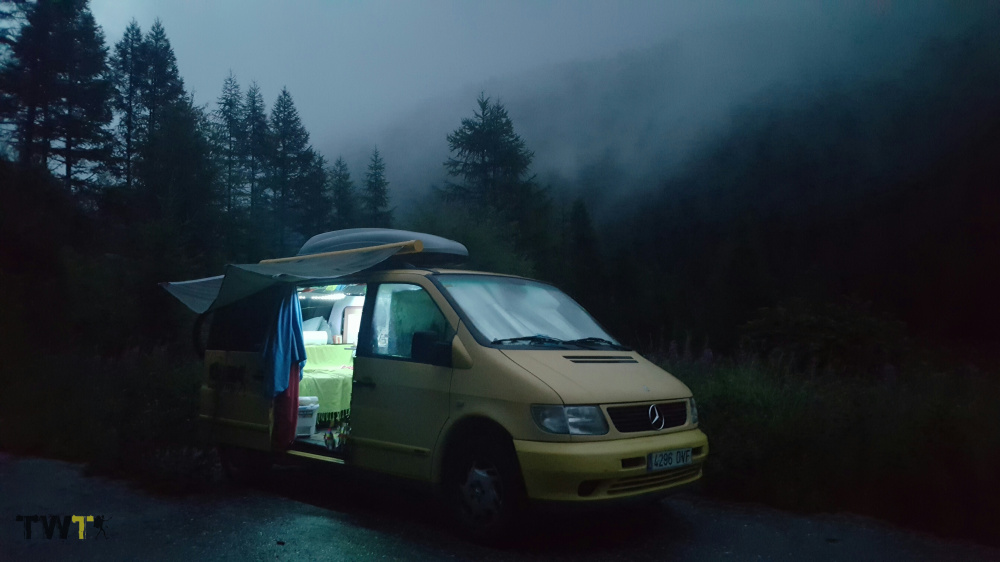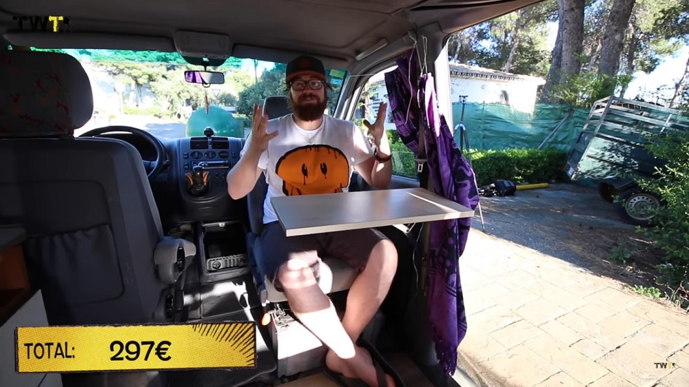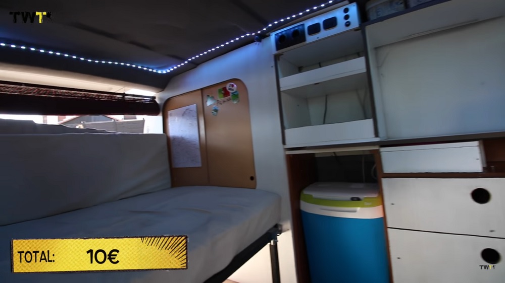 Os dois parceiros começaram por comprar uma Mercedes Vito de 1999, o que fizeram em 2014. Como a transformação ia ser caseira, o design não custou nada. A partir daí era só escolher os materiais. Para começar, foi necessário instalar uma bateria secundária, devido aos elementos elétricos adicionais. A bateria custou 296 euros, o inversor 125, os cabos 30, quadro elétrico 25 e o interruptor 70. No total, esta secção custou 546. Foi também instalado um assento de base giratória no lugar do banco do passageiro, custando apenas 90 euros.