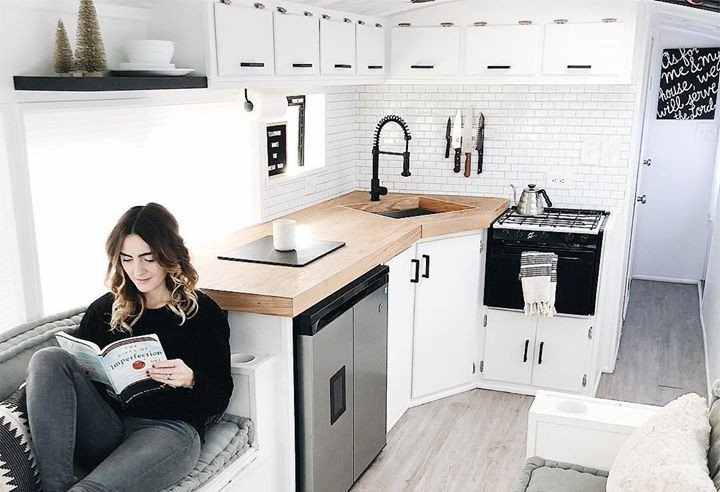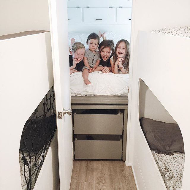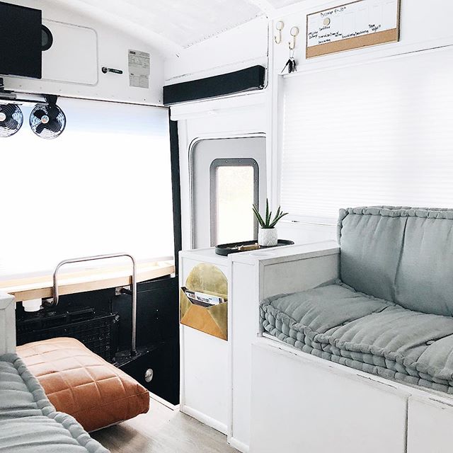 A cozinha partilha espaço com uma mesa retrátil e dois sofás, junto à “sala” de estar. Um dos sofãs tem espaço para arrumação de objetos, e o frigorífico cabe debaixo do balcão. A casa de banho separa a sala dos quartos, com as crianças a dormirem em quatro beliches laterais e a cama de casal montada na traseira, sobre gavetas.