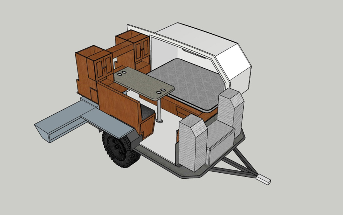 O eixo utiliza o mesmo tipo de suspensão encontrado em pick-ups preparadas para transporte de cargas com pesos elevados, e inclui pneus para TT de 16 polegadas da BFGoodrich e travões elétricos. Uma bateria de 6 volts e quadro de 30 amperes deve chegar para a maioria dos equipamentos elétricos. A área cozinha é montada do lado de fora, e fica escondida quando a mini-caravana está em andamento, beneficiando ainda de um reservatório de água fresca de 97 litros e ligações para uma garrafa de gás propano. Ar condicionado e painéis solares são opcionais. Está disponível desde 22.850 dólares (19.960 euros).