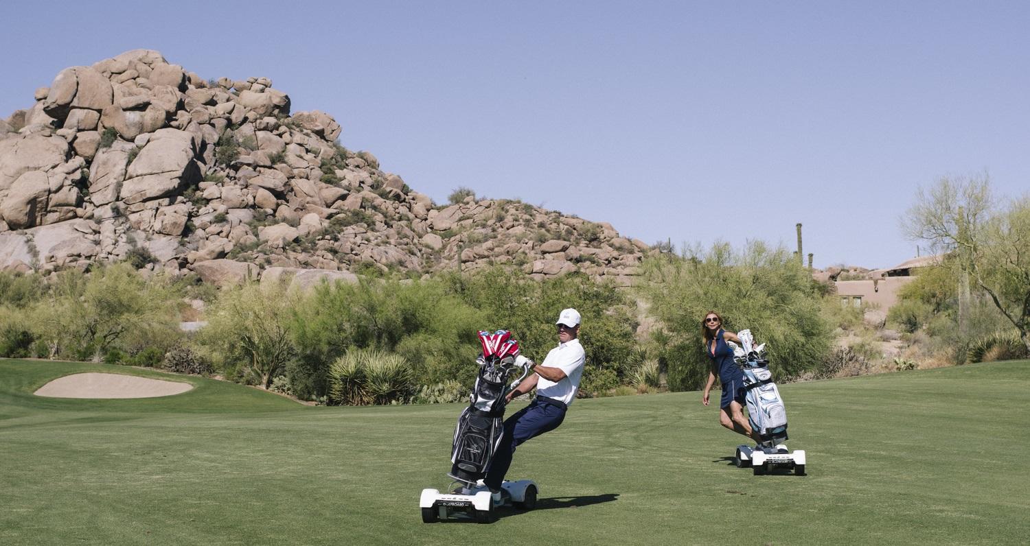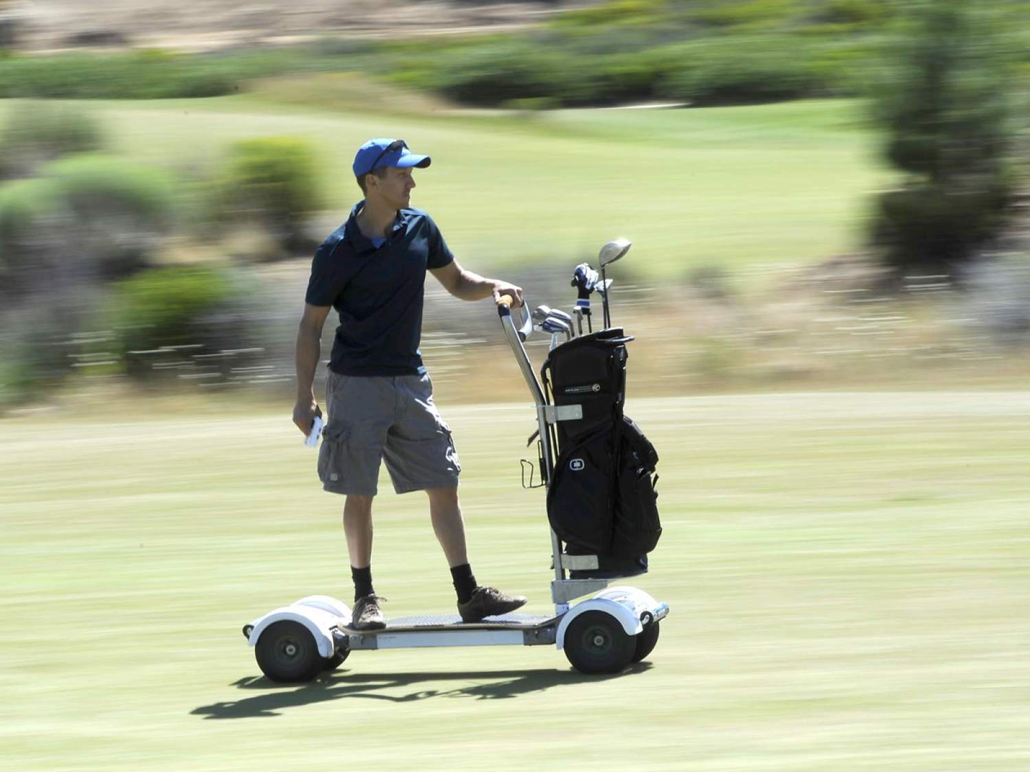Para quem tem medo de perder o equilíbrio num skate, não há hipótese de isso acontecer. Tal como uma trotinete, tem um guiador, que lhe permite controlar o movimento do GolfBoard, podendo circular com os dois pés calmamente plantados sobre a base e os sacos de golfe pendurados num suporte. Este veículo pessoal está equipado com dois motores elétricos, um em cada eixo, oferecendo-lhe quatro rodas motrizes, ideal para andar sobre relva. Como pode deslocar-se a qualquer lugar sem interferir na jogada, pode fazer um jogo de 36 buracos em menos de cinco horas, perdendo apenas dois minutos e 37 segundos por jogada.
