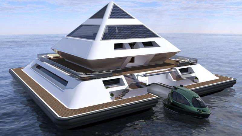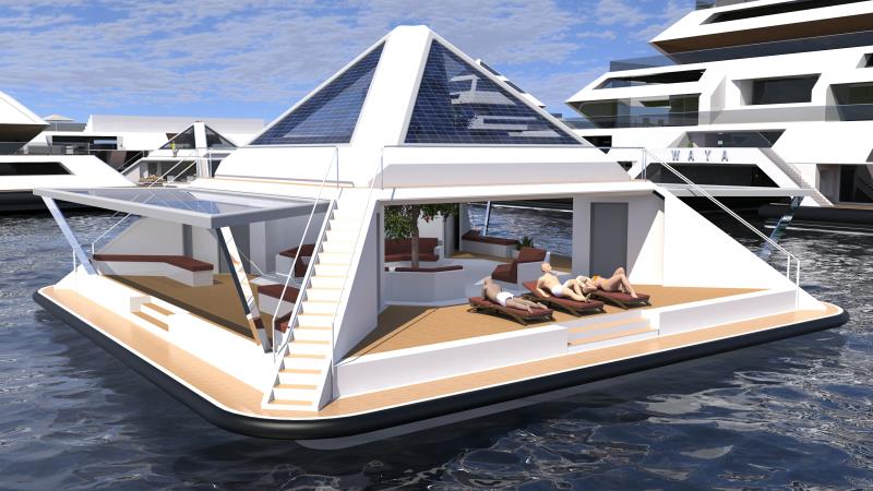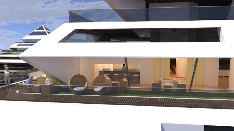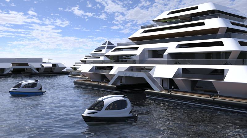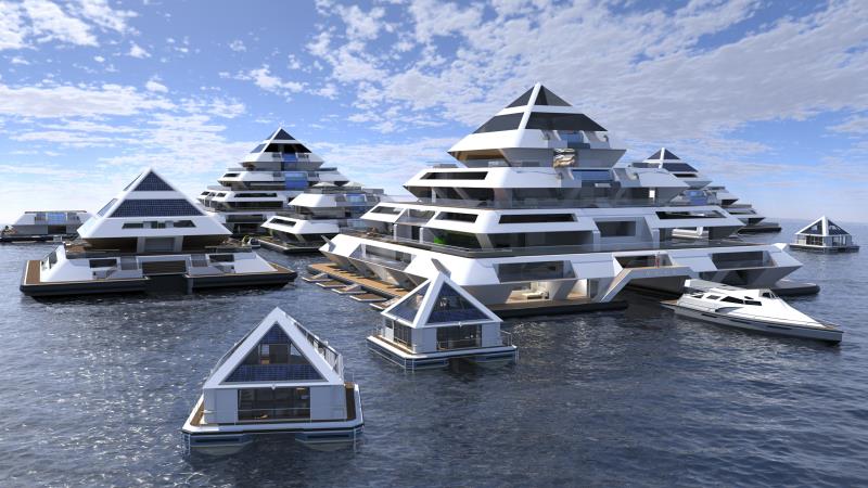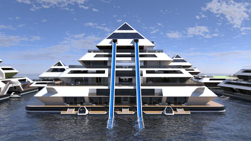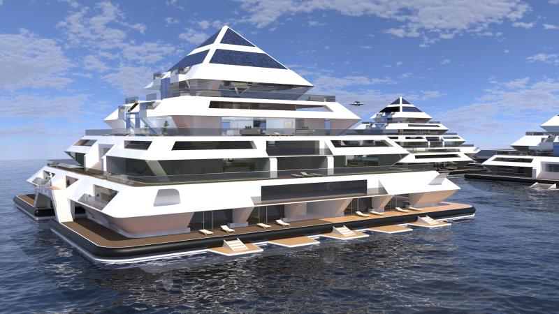 Lazzarini inspirou-se na arquitetura das pirâmides maias e dos templos xintoístas japonesas para criar os edifícios montados sobre uma plataforma flutuante. Cada plataforma tem uma dimensão máxima de 54 por 54 metros (2900 metros quadrados de área), e pode acomodar uma casa, um hotel, bar, cinema e até um jardim público. A maneira como os blocos são montados sobre a plataforma permite criar um edifício com uma altura máxima de 30 metros ou 10 andares, com uma área total de 6500 metros quadrados.