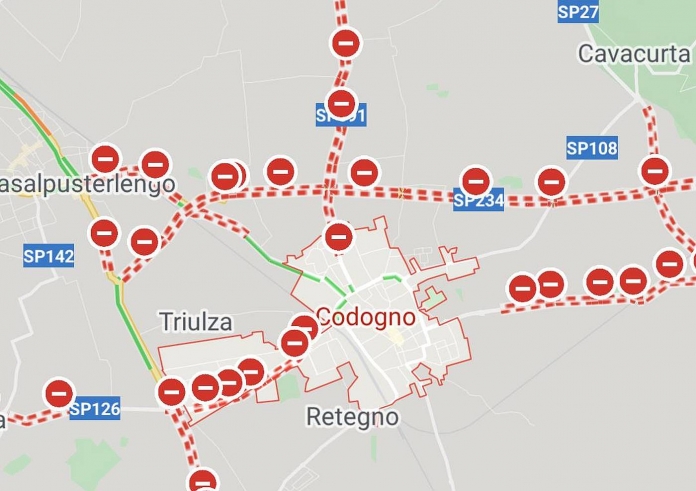 Quase um ano depois, um ‘printscreen’ da aplicação Google Maps no smartphone, foi partilhada no Reddit, expondo com rigor o isolamento a que a cidade de Codogno foi votada naqueles dias, com barreiras policiais a controlarem o movimento nas estradas no dia 24 de fevereiro de 2020, precisamente dois dias depois de se ter imposto o ‘lockdown’ naquela região. Sabe-se hoje que as restrições acabariam por ser pouco eficazes em virtude do alastramento do vírus já naquela data bem para lá dos limites daquela que ficou conhecida por ‘zona vermelha’.