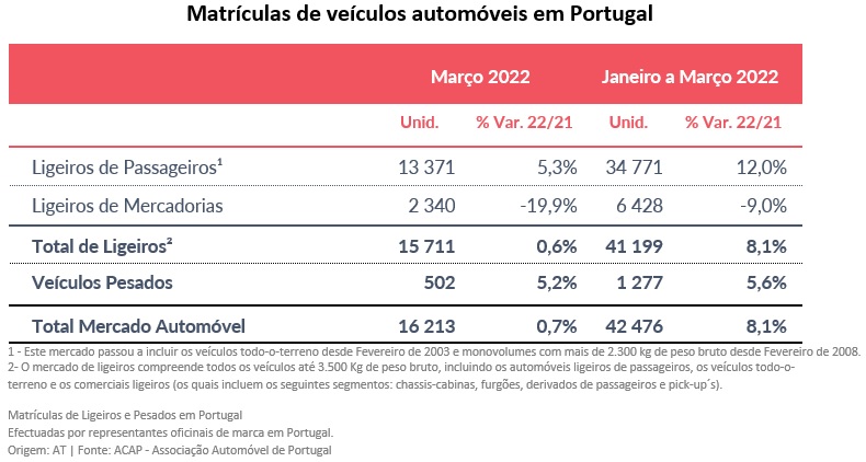 De acordo com os dados da Associação Automóvel de Portugal (ACAP), registou-se um ligeiro crescimento nas vendas de automóveis novos em Portugal no mês de março, com mais 0,7% do que no mesmo mês de 2021, para um valor de 16.213 veículos matriculados. Comparado com o mesmo mês pré-pandemia, ou seja, março de 2019, regista-se uma descida de 43,2%.